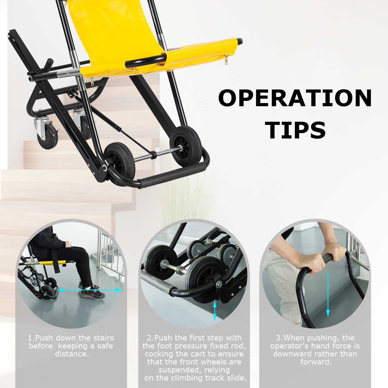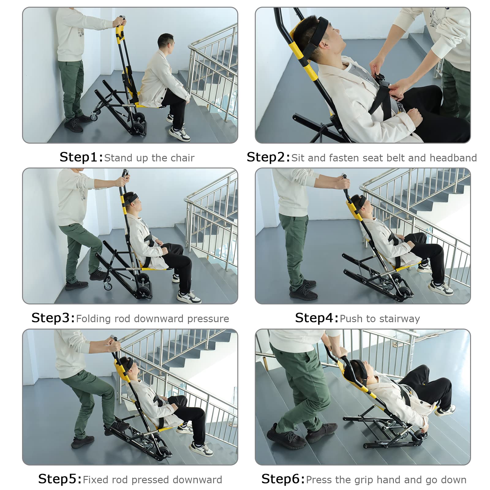 - Funkcija: Tas ir lielisks līdzeklis, lai palīdzētu pacientiem vai cilvēkiem ar invaliditāti evakuēties pa kāpnēm. To var izmantot arī kā ratiņkrēslu uz grīdas neatkarīgi no tā, vai tā ir līdzena vai nelīdzena. Aizmugurējos riteņus var nofiksēt, lai tie vienmēr paliktu nekustīgi. PIEZĪME: TAS IR PIEMĒROTS TIKAI KĀPNĒM, NEVAR UZKĀPT AUGŠUP