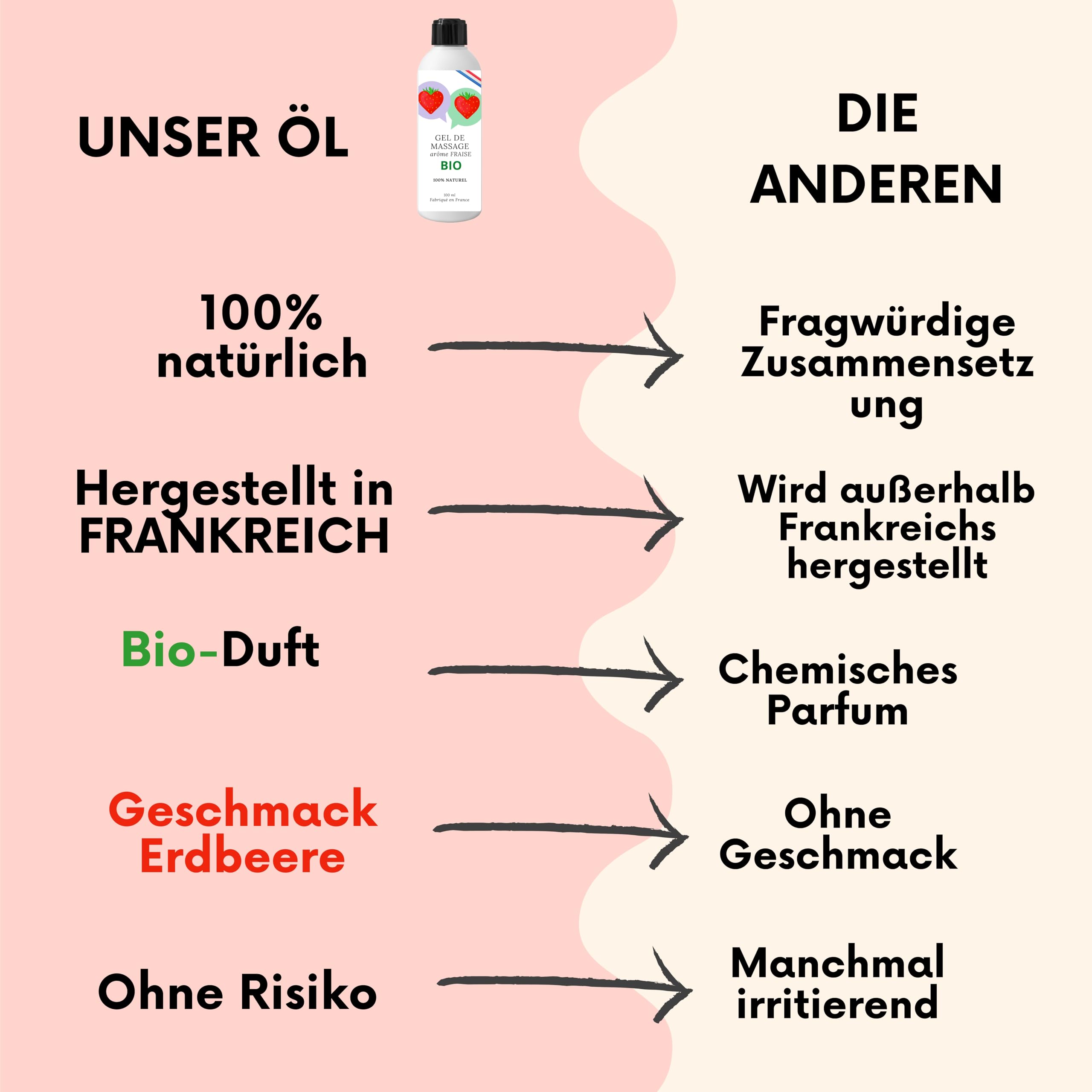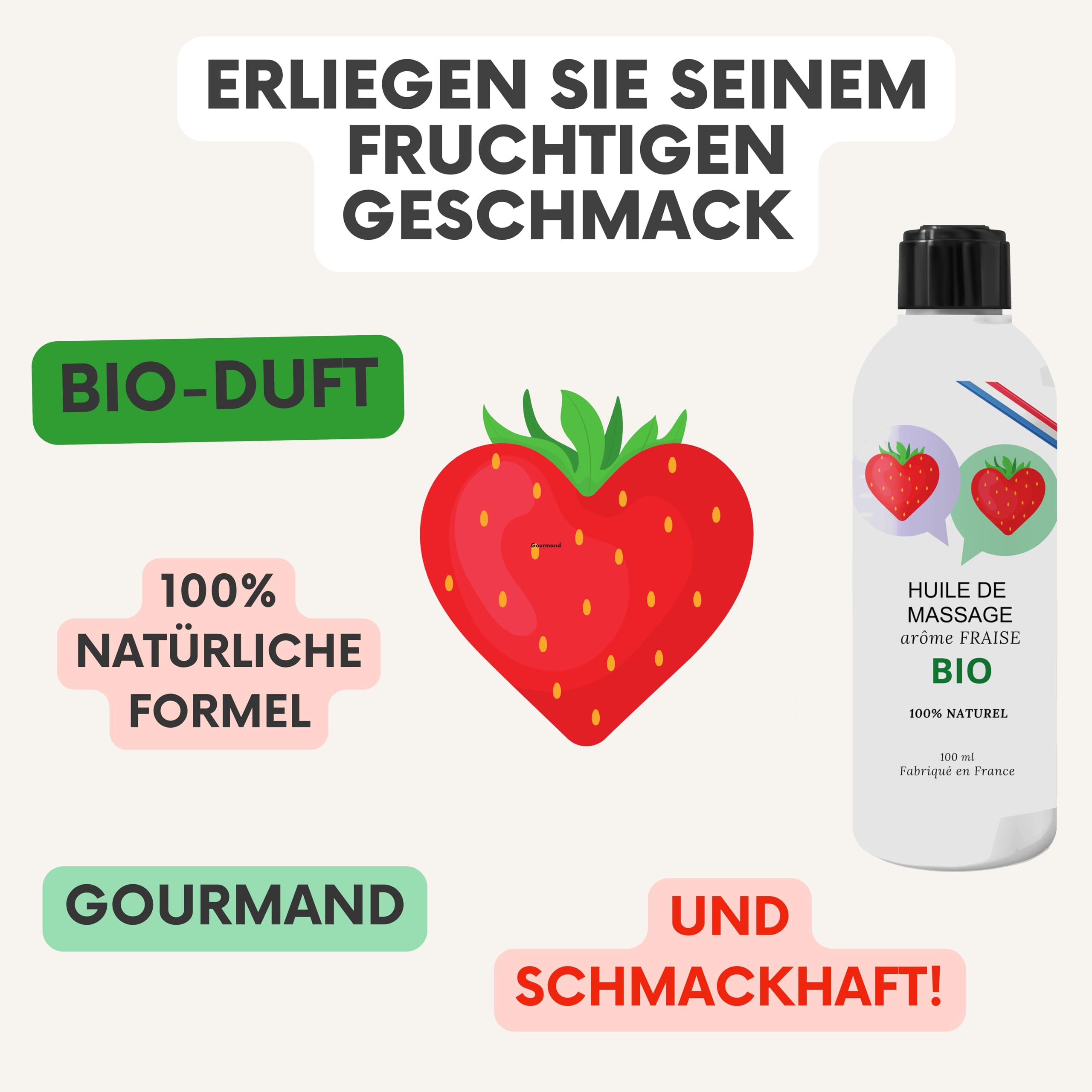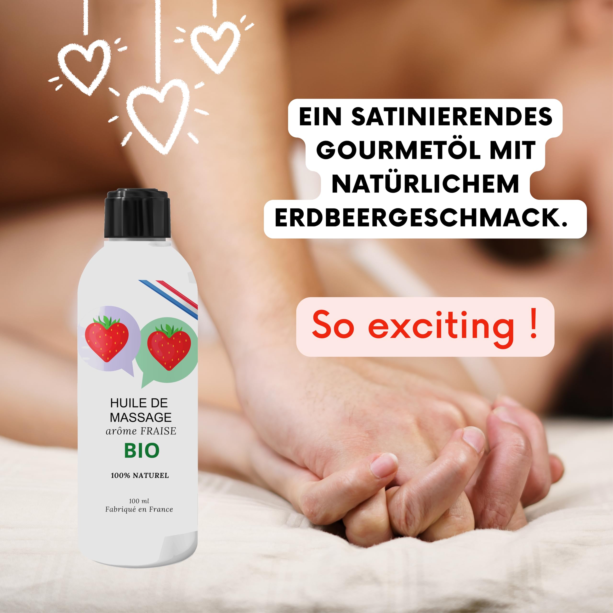 Šī organiskā zemeņu masāžas eļļa ir patīkama lietošanā un 100% dabīga. Lieliski piemērots relaksācijas brīdim, mums patīk tā unikālā tekstūra un dabiskā formula, kas izstrādāta kopīgiem mirkļiem. Kā pāris jūs noteikti novērtēsiet tā lubrikējošo efektu un augļaino mutes dobuma aromātu gan relaksācijas brīdim, gan erotiskam un aizraujošam mirklim piepildītai seksuālajai dzīvei. Ražota Francijā, šī augstas kvalitātes, profesionālā eļļa ir neaizstājama labam laika pavadīšanas veidam! Uzklāt tieši uz ķermeņa intīmajā zonā. Izoë mēs strādājam ar kvalitatīviem produktiem, kuru formulas ir organiskas un 100% dabīgas, lai piedāvātu Jums labāko, neapdraudot Jūsu ādu, veselību un labsajūtu. Mūsu produkti tiek ražoti un testēti tikai Francijā, laboratorijā Bretaņā. Palutiniet sevi ar ilgas un seksuāla baudījuma mirkli. Izbaudiet baudas un iekāres mirkli. Lietošanas instrukcija Uzklāt tieši uz ķermeņa intīmajā zonā