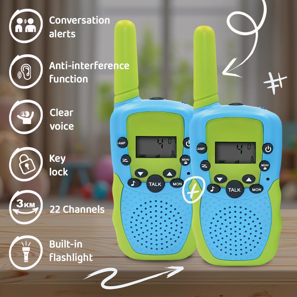 - Droša izklaide bērniem — 8 kanāli ar 99 kodiem nodrošina drošas un privātas sarunas, kamēr jūsu bērni var netraucēti spēlēties un sazināties.