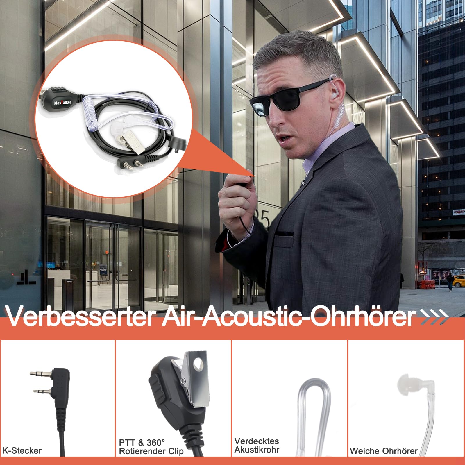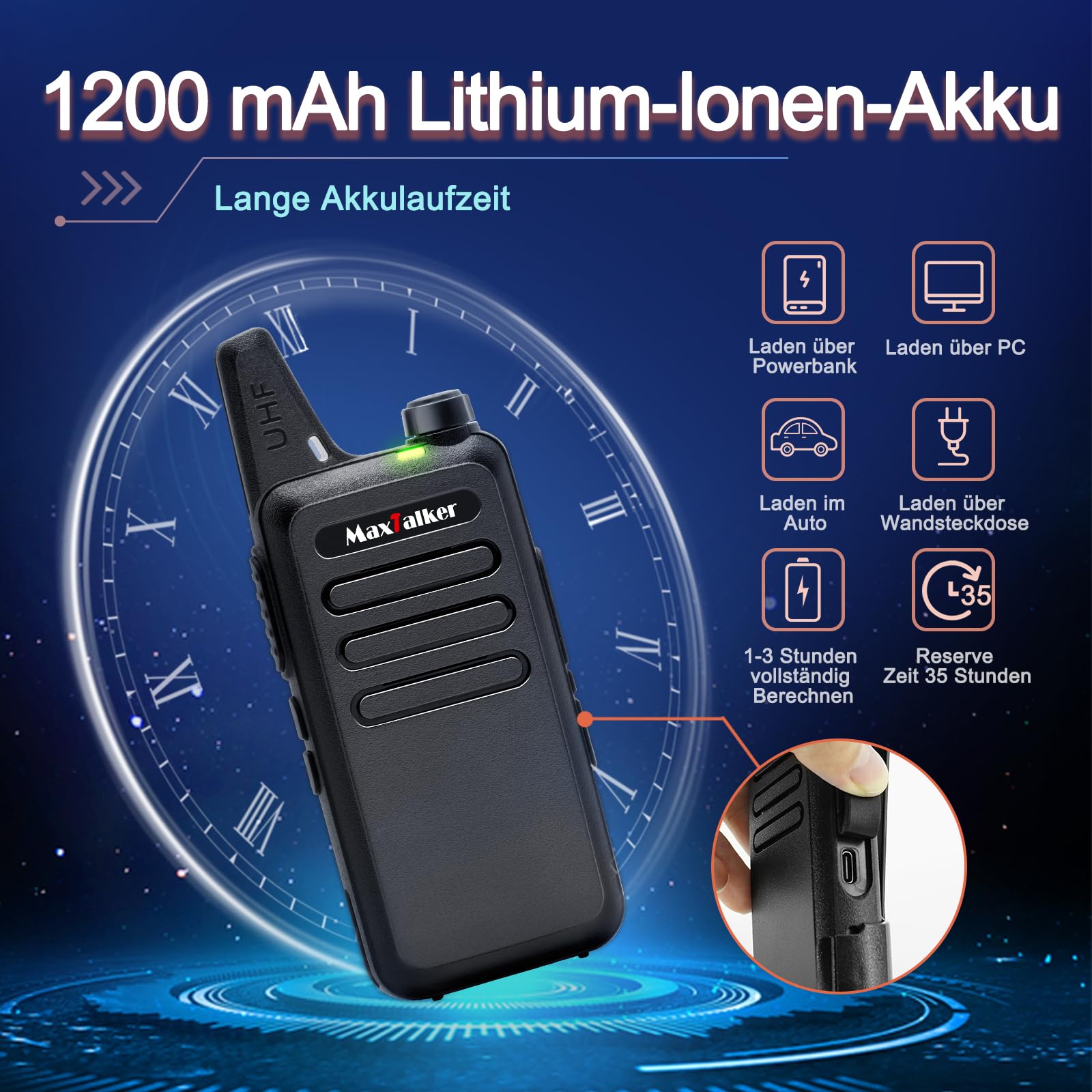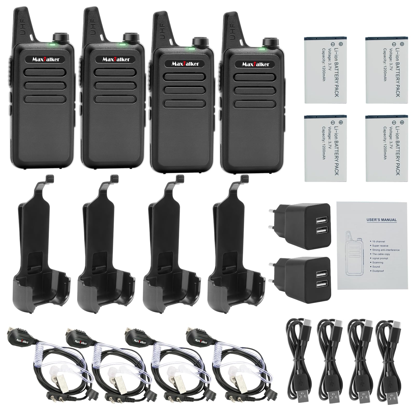 MaxTalker MT1 uzlādējama rācija pieaugušajiem un bērniem, VOX rācija ar 1200mAh litija jonu akumulatoru, USB lādētāju un austiņām. Rācijas lietošanai ārpus telpām, kempingam, pārgājieniem, 4 gabalu komplekts.