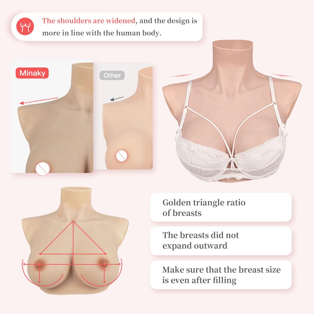 - [Humanizēts dizains] Silikona krūšu forma optimizē atslēgas kaulu un kakla cīpslu, pagarina plecus, atslēgas kaulu līnija ir skaidrāka un dabiskāka. Augstā kakla izgriezuma dizains noslēpj kaklu; ja apkakle ir pārāk augsta, to var nogriezt piemērotā pozīcijā. Jūs varat valkāt kleitas ar dziļu kakla izgriezumu un atvērtu muguru un jebkurā laikā parādīt savu dabisko dekoltē.
