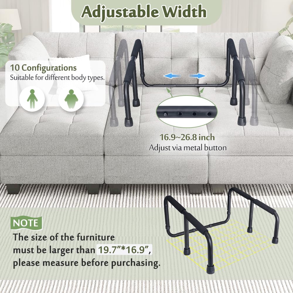 - Vienkārša uzstādīšana: Dizains bez instrumentiem ļauj ātri uzstādīt tikai dažu minūšu laikā. PIEZĪME: ➊ Minimālais nepieciešamais sēdekļa izmērs: 19,7 × 42,9 cm — pirms iegādes pārbaudiet dīvāna izmērus. ➋ Nav piemērots mīkstām virsmām, piemēram, piepūšamām dīvānām, matračiem vai ūdensgultām.