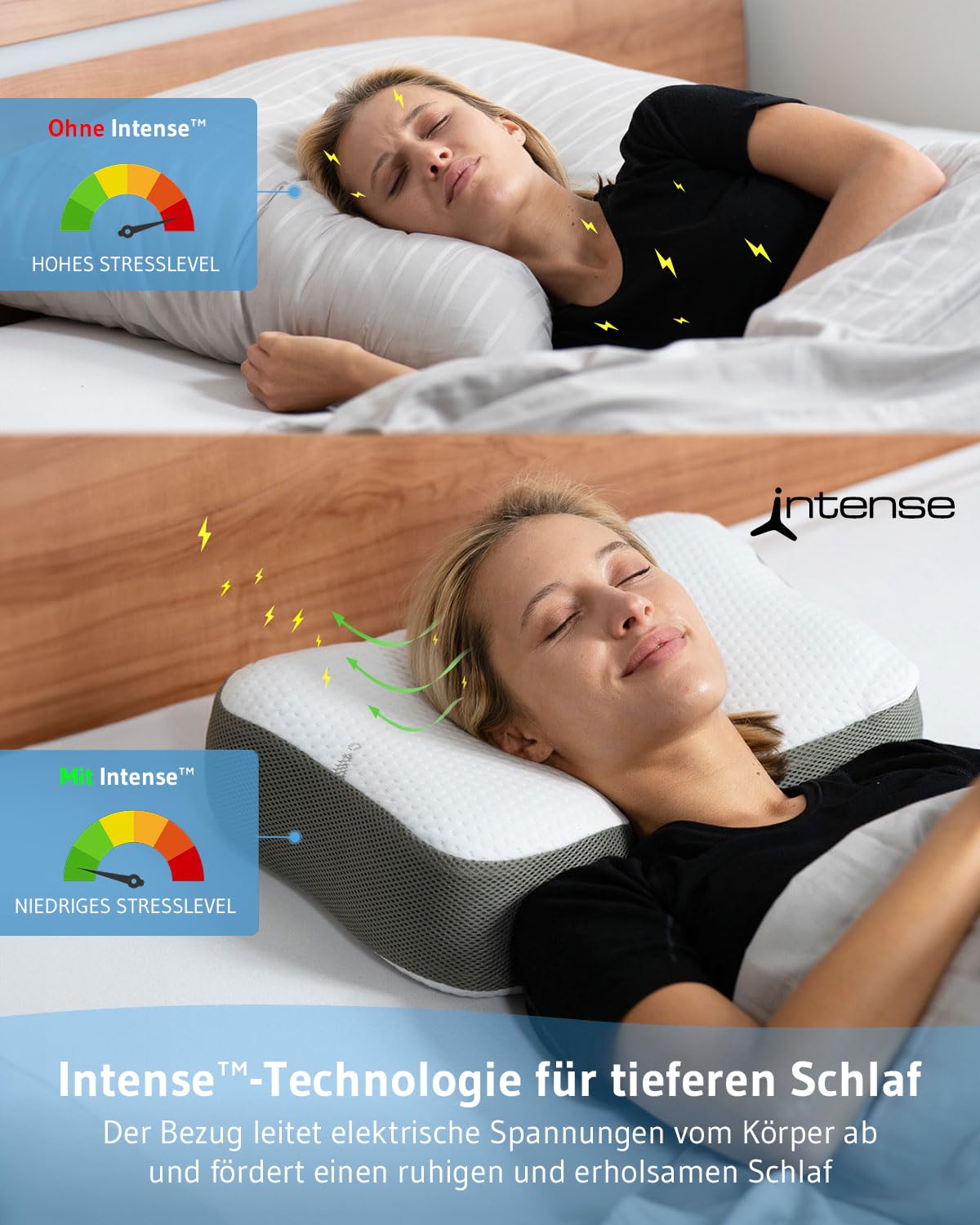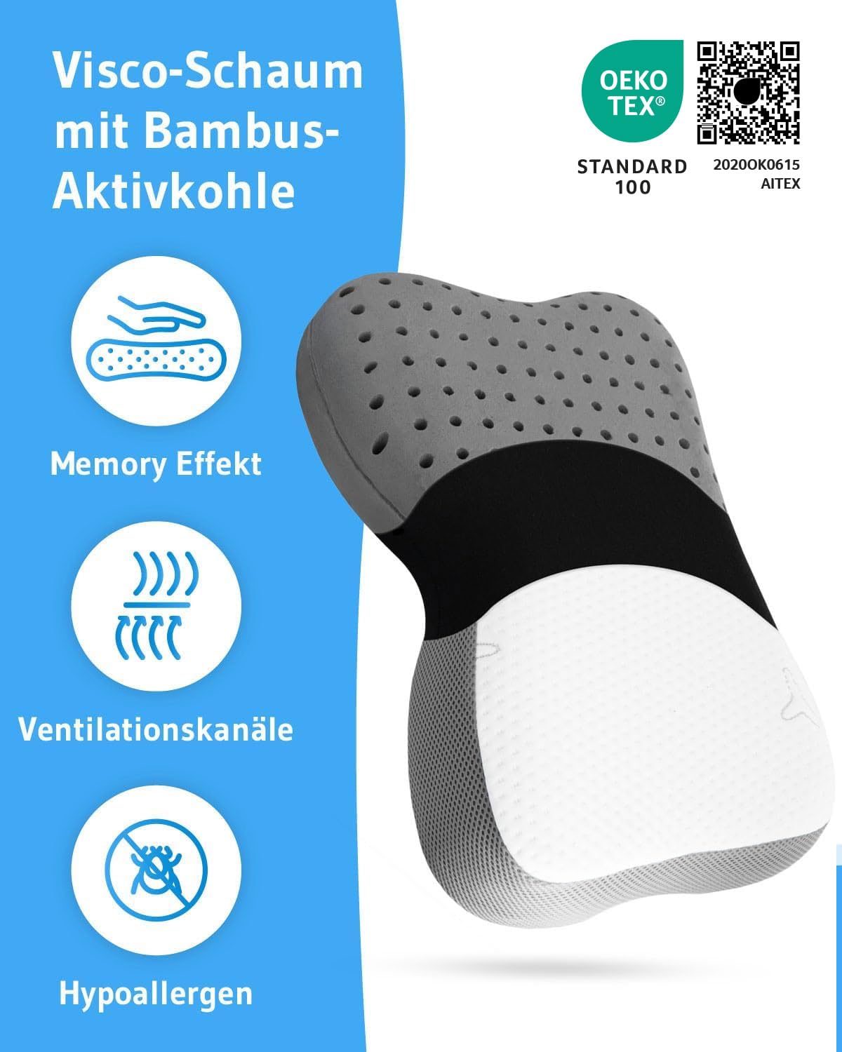 Kakla spilvens Re-Charge Intense | Ortopēdisks kakla mugurkaula spilvens guļošajam uz sāniem | Ergonomiskas atmiņas putas ar bambusa aktivēto ogli, inovatīva tehnoloģija dziļākam miegam, atpūtas spilvens 50x30x12