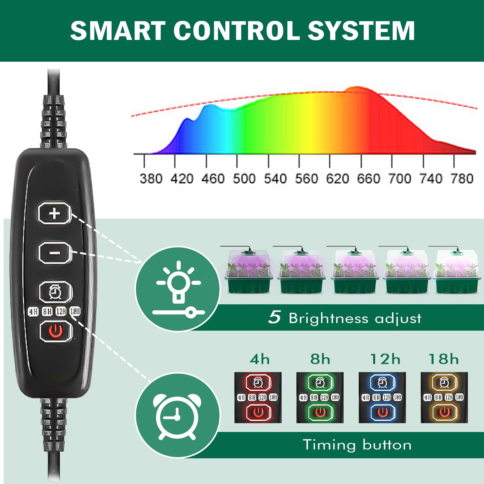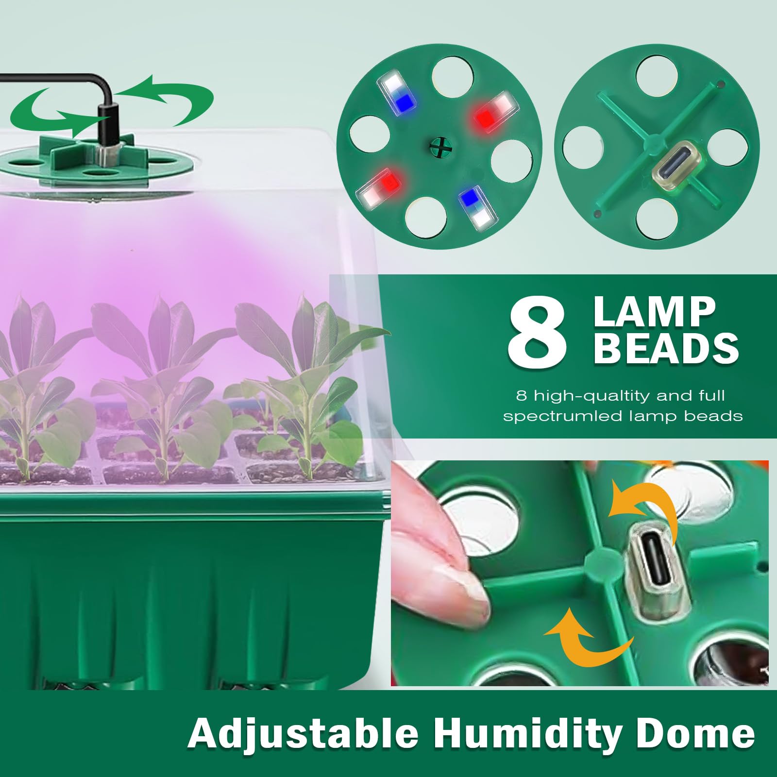 - 🌱【Pilna spektra LED audzēšanas lampas】Katrā sēklu stādīšanas paplātē ir iekļautas 8 pilna spektra LED audzēšanas lampas. Tajā ir 2 zilas un 2 sarkanas gaismas, lai nodrošinātu fotosintēzi sēklu dīgšanai, tāpat kā dabiskā saules gaismā. Katram caurspīdīgajam mitruma kupolam ir 4 regulējamas apaļas ventilācijas atveres, kuras var viegli pagriezt, lai regulētu iekšējo mitrumu un temperatūru, veicinātu gaisa cirkulāciju un kontrolētu sēklu dīgšanas procesu.