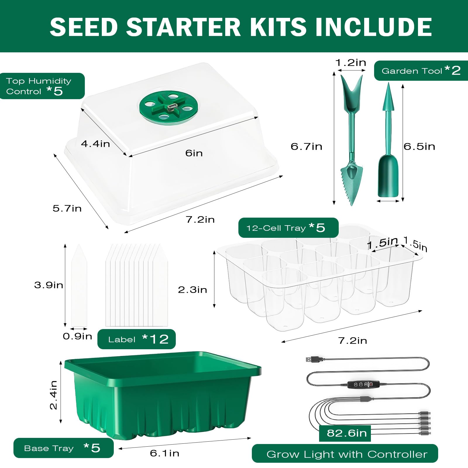 - 🌱【Ko jūs iegūstat】Sēklu sākuma komplektā ietilpst: 5 sēklu paplātes (katrā 12 šūnas), 5 regulējami mitruma kupoli, 5 audzēšanas lampas (katrā 8 LED), 5 caurspīdīgi vāki, 5 augsnes paplātes, 1 viedā vadības sistēma, 12 augu etiķetes, 2 stādīšanas rīki, sēklu iesācējs, kas ir ideāli piemērots puķu stādu diedzēšanai un sēklu augšanas uzsākšanai.