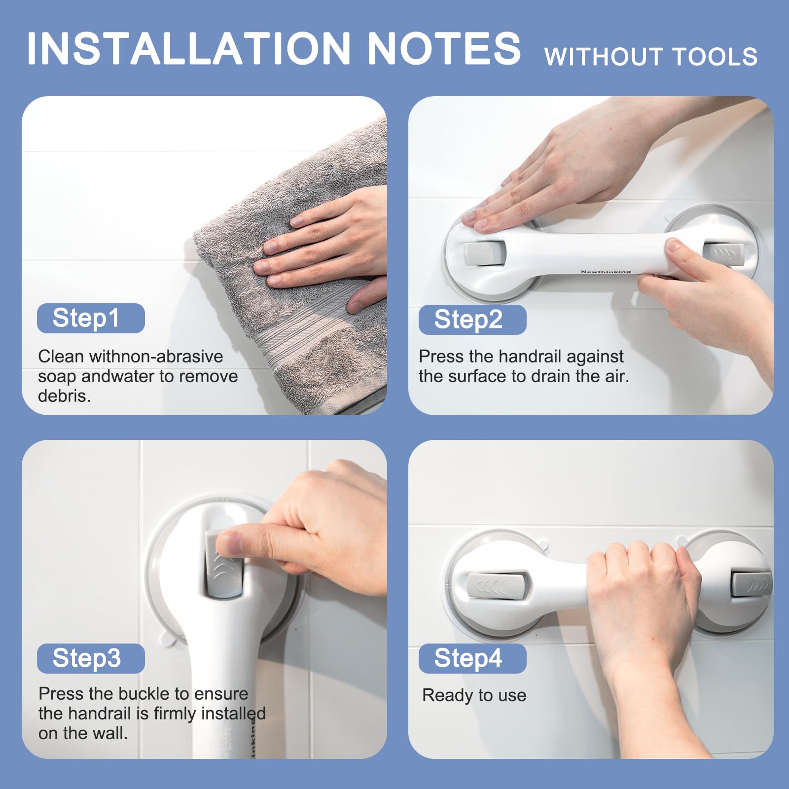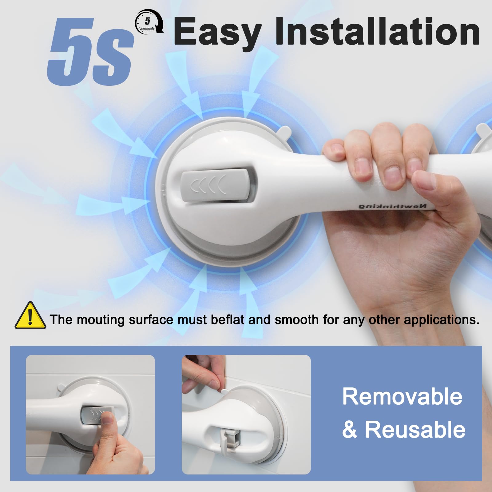 - Jauni, piesūcekņa tipa vannas istabas rokturi sniedz jums stabilu pārliecību slidenās vietās. Spēcīgais piesūcekņa dizains darbojas uz jebkuras neporainas, līdzenas virsmas, tostarp gludām flīzēm, stikla, porcelāna vai stiklšķiedras. Lūdzu, ņemiet vērā, ka nelīp pie nelīdzenām vai raupjām virsmām