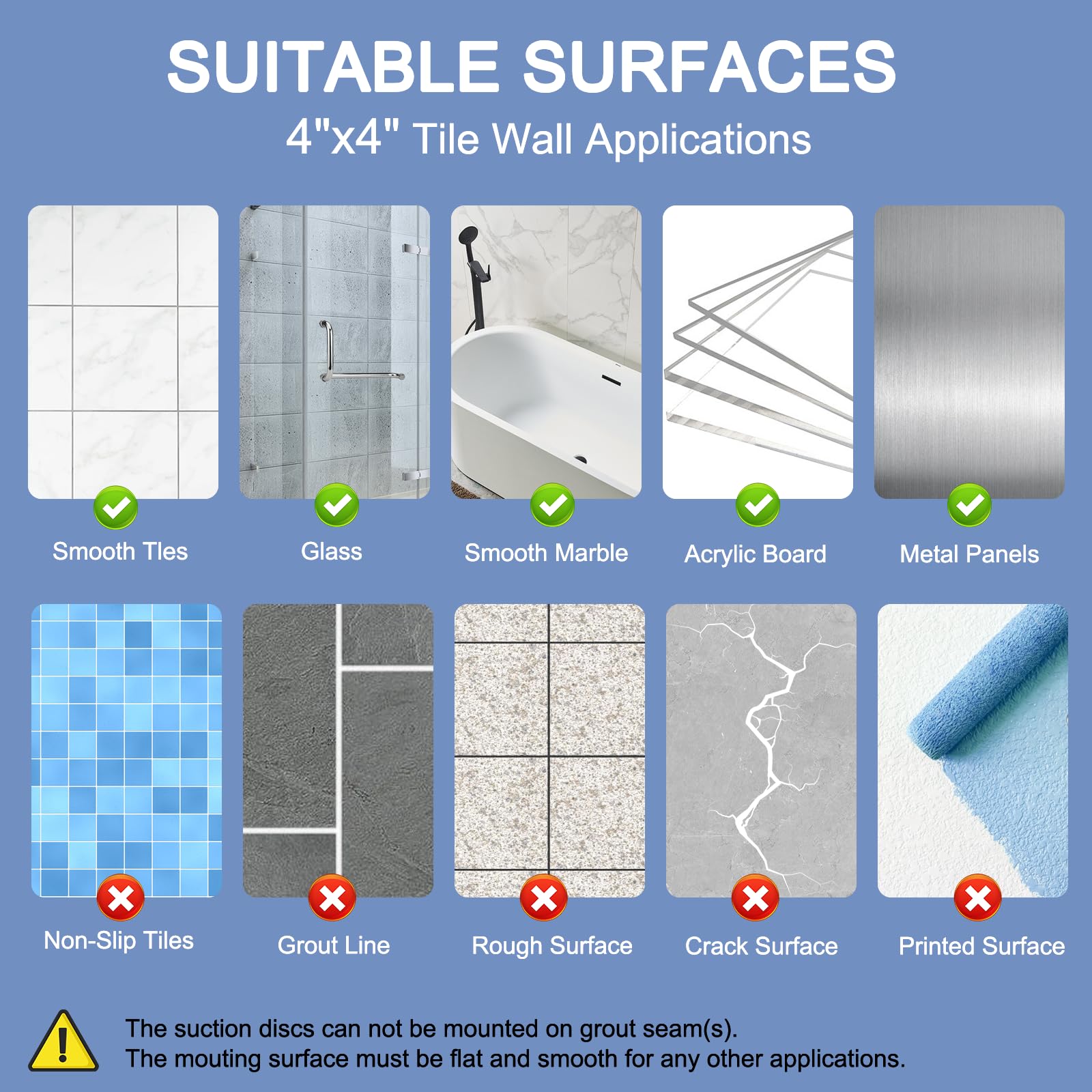 - LŪDZU, IZLASIET ŠO PIRMS PIRMS PIRKSTĀT. Lai nodrošinātu pietiekamu sūkšanas jaudu, 1)✔ Šis piesūceknis darbojas tikai uz flīzēm, KAS LIELĀKAS PAR 4" x 4". 2)✔ Piesūcekņus nevar uzstādīt uz savienojumiem. . 3)✔ Pārliecinieties, ka dušas sienai nav tekstūras. 4)✔ Visos citos pielietojumos montāžas virsmai jābūt līdzenai un gludai.