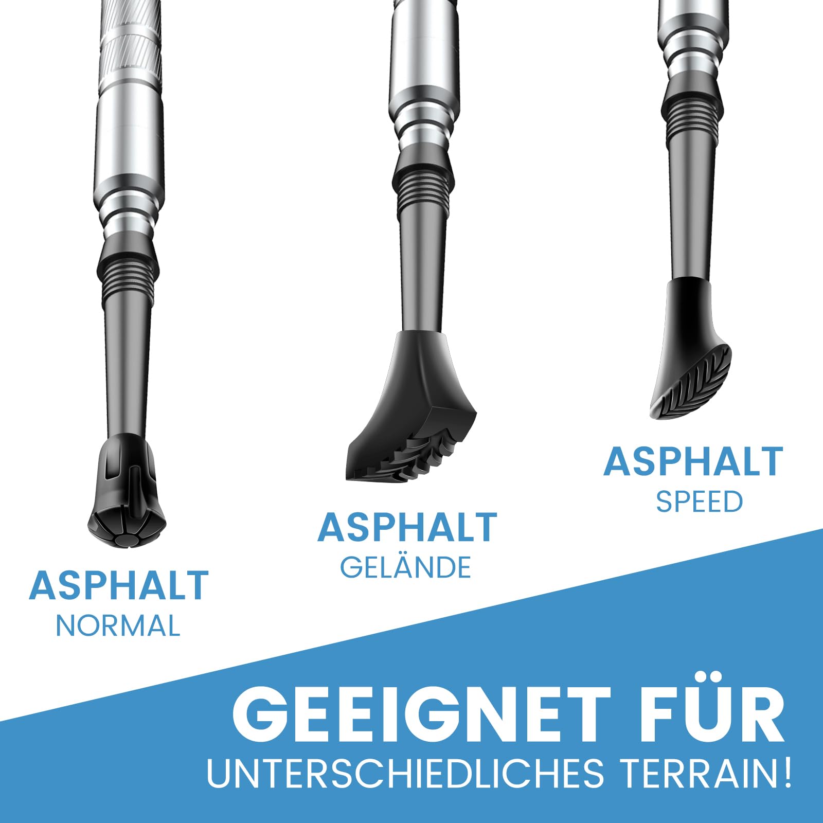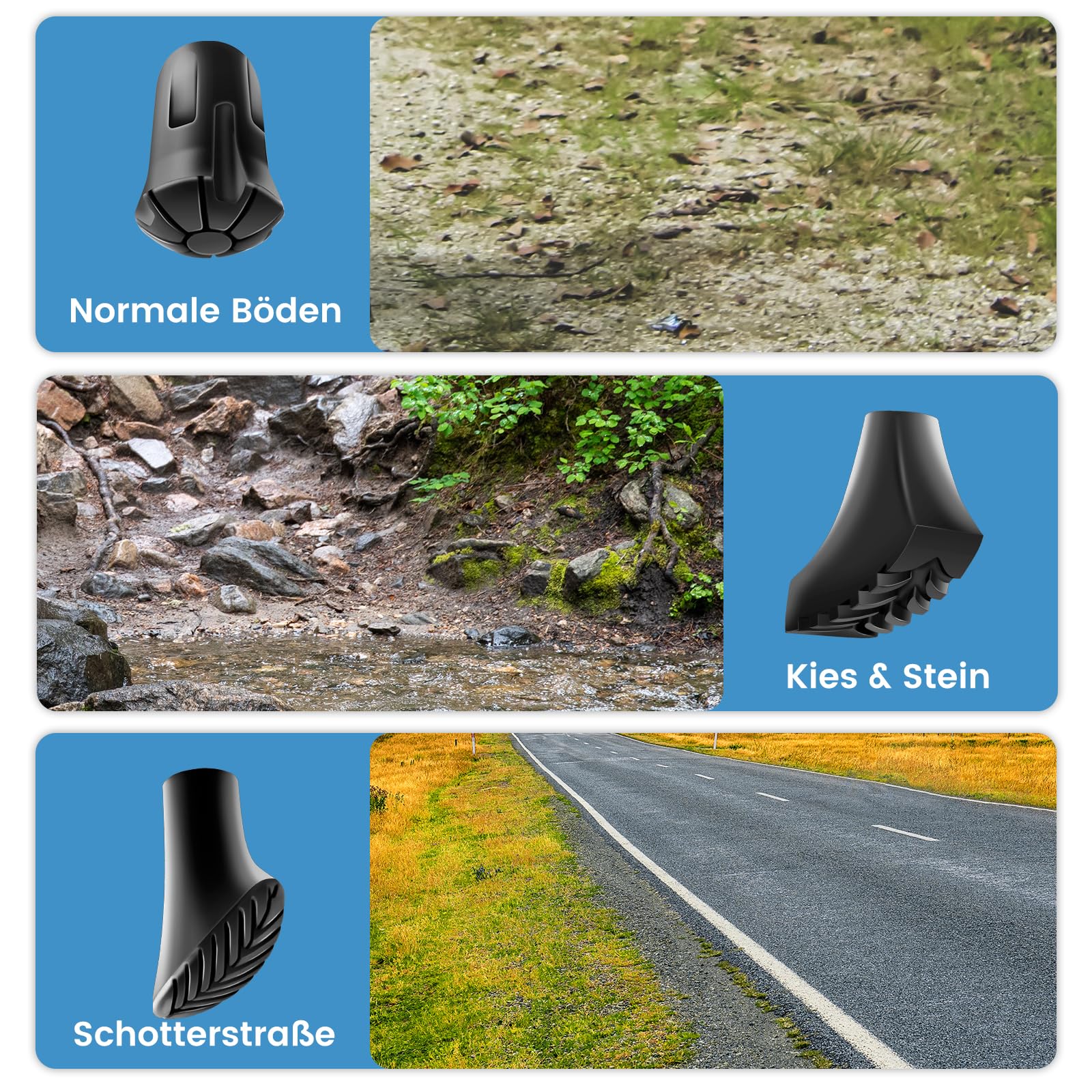 - Drošība un stabilitāte: Nūjošanas nūju gumijas buferi ir pieejami 3 dažādos dizainos un ir piemēroti dažādām virsmām. Lielajiem zābaku kronšteiniem ir dziļš profils, lai tie labāk darbotos sliktos laikapstākļos. Lielie apavu buferi ir piemēroti asfaltam, tie var absorbēt troksni. Apaļais gumijas buferis ir piemērots jebkuram reljefam un tam ir laba saķere.