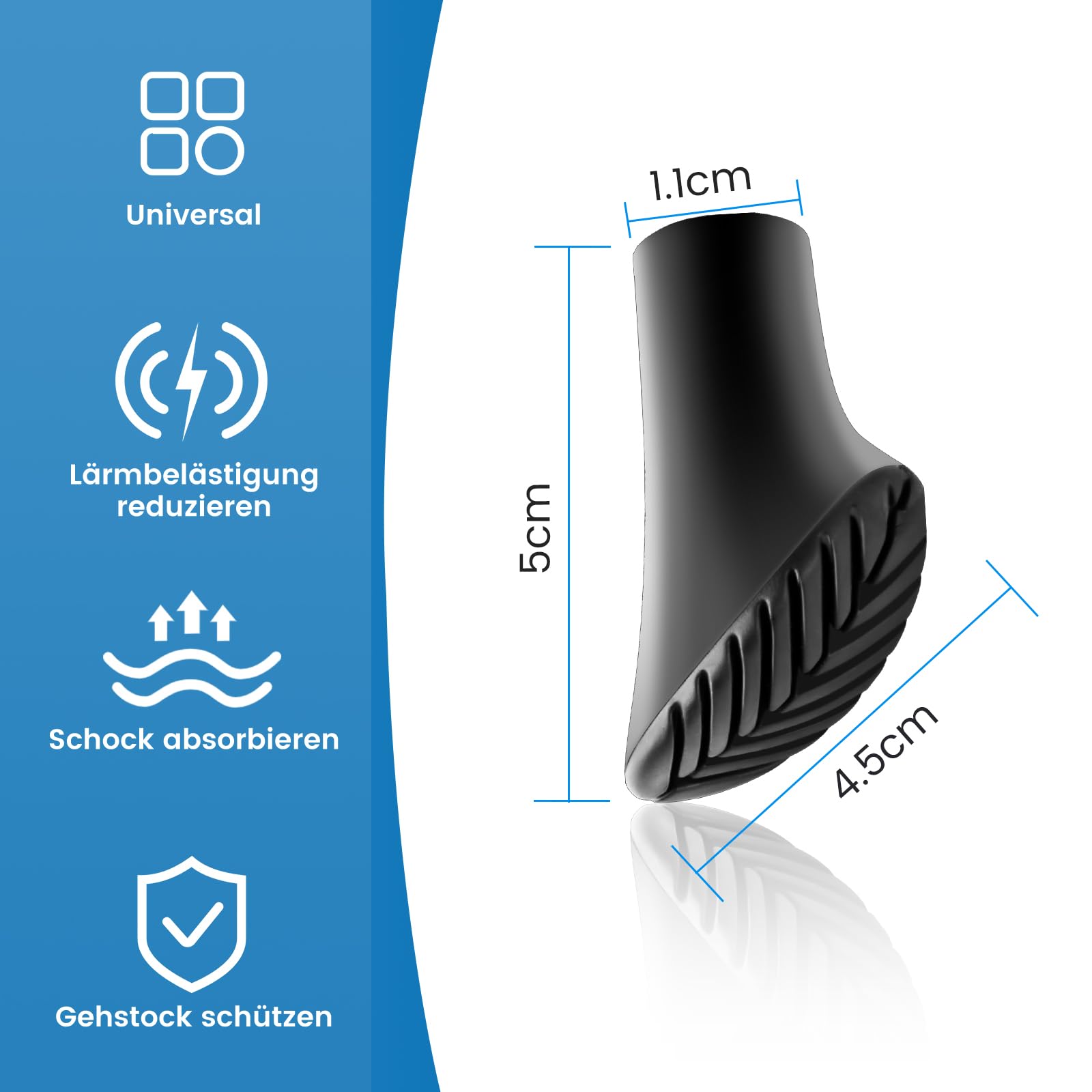 - Universāli: Iekšējais diametrs: 11 mm, gumijas buferi pastaigu nūjām ir piemēroti gan parastajiem pastaigu nūjām, gan nūjošanas nūjām. Pārgājienu gumijas buferis ir labs palīgs pārgājienos un kāpšanā. Gumijas pastaigu paliktņi sniedz labu sporta pieredzi un uzlabo veselību.