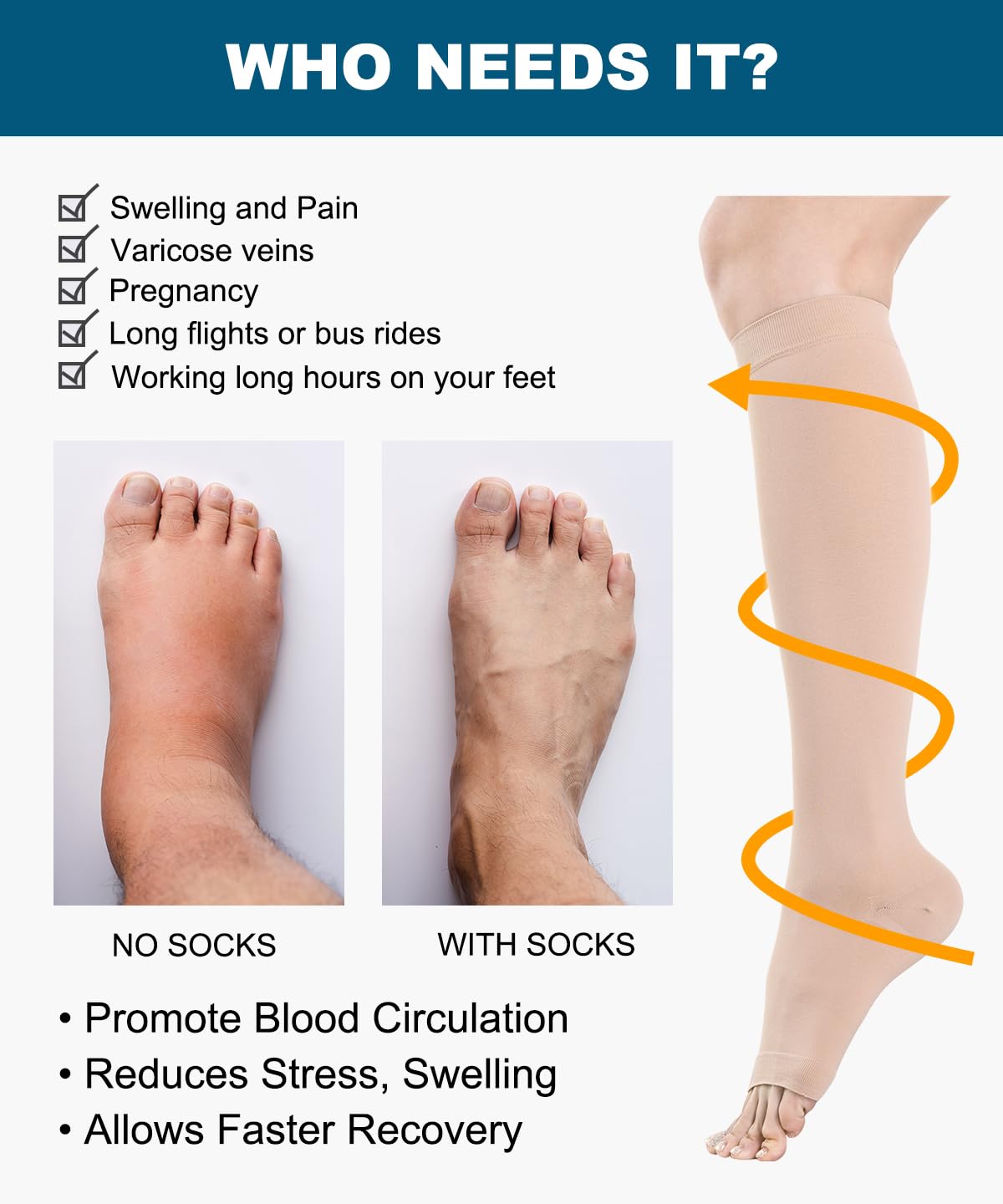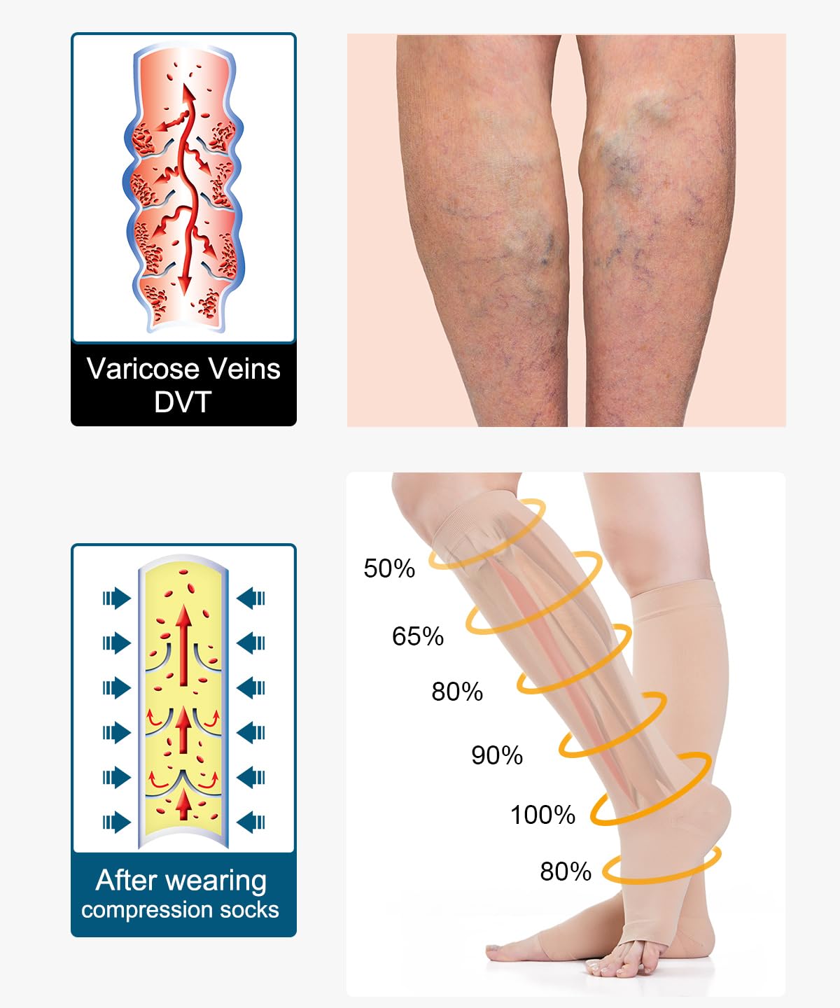 - Nodrošina spēcīgu atbalstu pēdai un ikram: Unikālais 5 līmeņu pakāpeniskās kompresijas dizains ir izstrādāts tā, lai spiediens būtu vislielākais potītes rajonā un pēc tam pakāpeniski samazinātos pāri ikram virzienā uz sirdi, radot drošu un ērtu spiedienu. Ideāli piemērots cilvēkiem ar pietūkušām kājām un pēdām, atgūstoties pēc operācijas, varikozām vēnām, tīklveida vēnām, vēnu trombozes, grūtniecības, ilgstošas stāvēšanas, mazkustīga darba, tālsatiksmes lidojumiem un ikdienas fiziskām aktivitātēm.