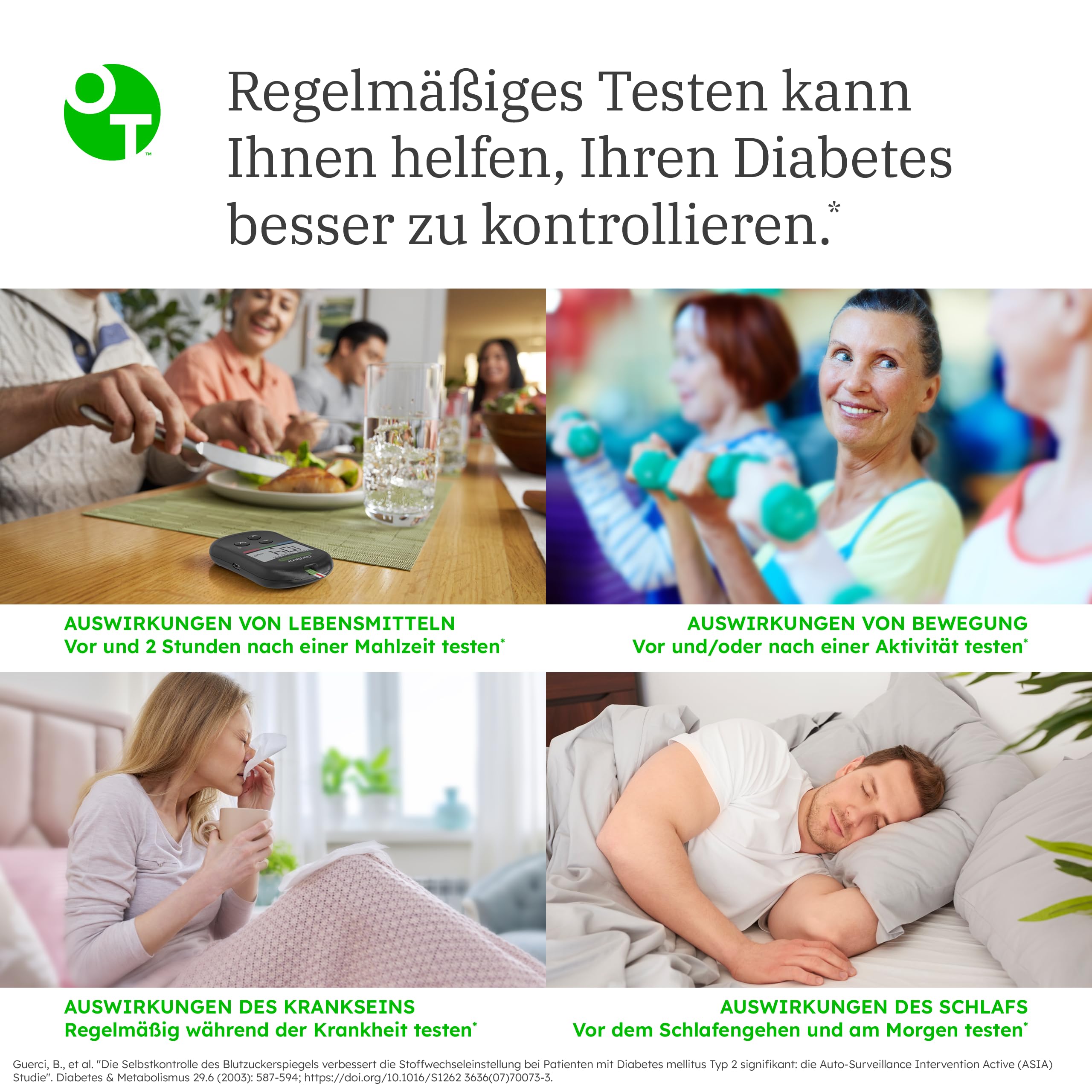 - VAI ZINĀJI? Regulāras pārbaudes var palīdzēt labāk kontrolēt cukura līmeni asinīs. Pārbaudes pirms un/vai pēc dažādām situācijām, piemēram, ēšanas, vingrošanas vai braukšanas, var palīdzēt labāk pārvaldīt diabētu.