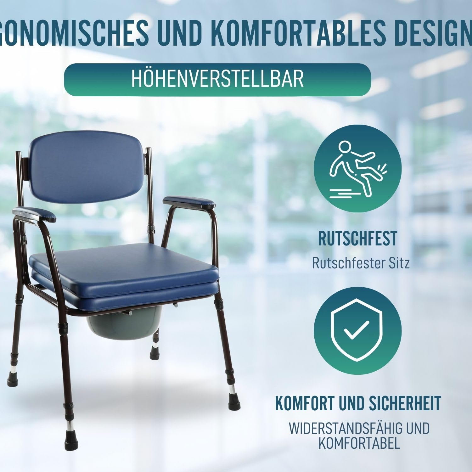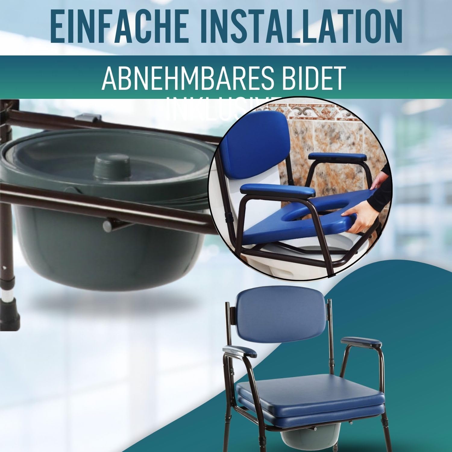 - ELEGANCE UN PRAKTISKUMS: Šis saliekamais tualetes krēsls apvieno eleganci un funkcionalitāti. Tas ir izgatavots no ļoti izturīgiem materiāliem un aprīkots ar noņemamu, polsterētu pārvalku. To var izmantot arī kā parastu krēslu – praktiski, diskrēti un stilīgi.