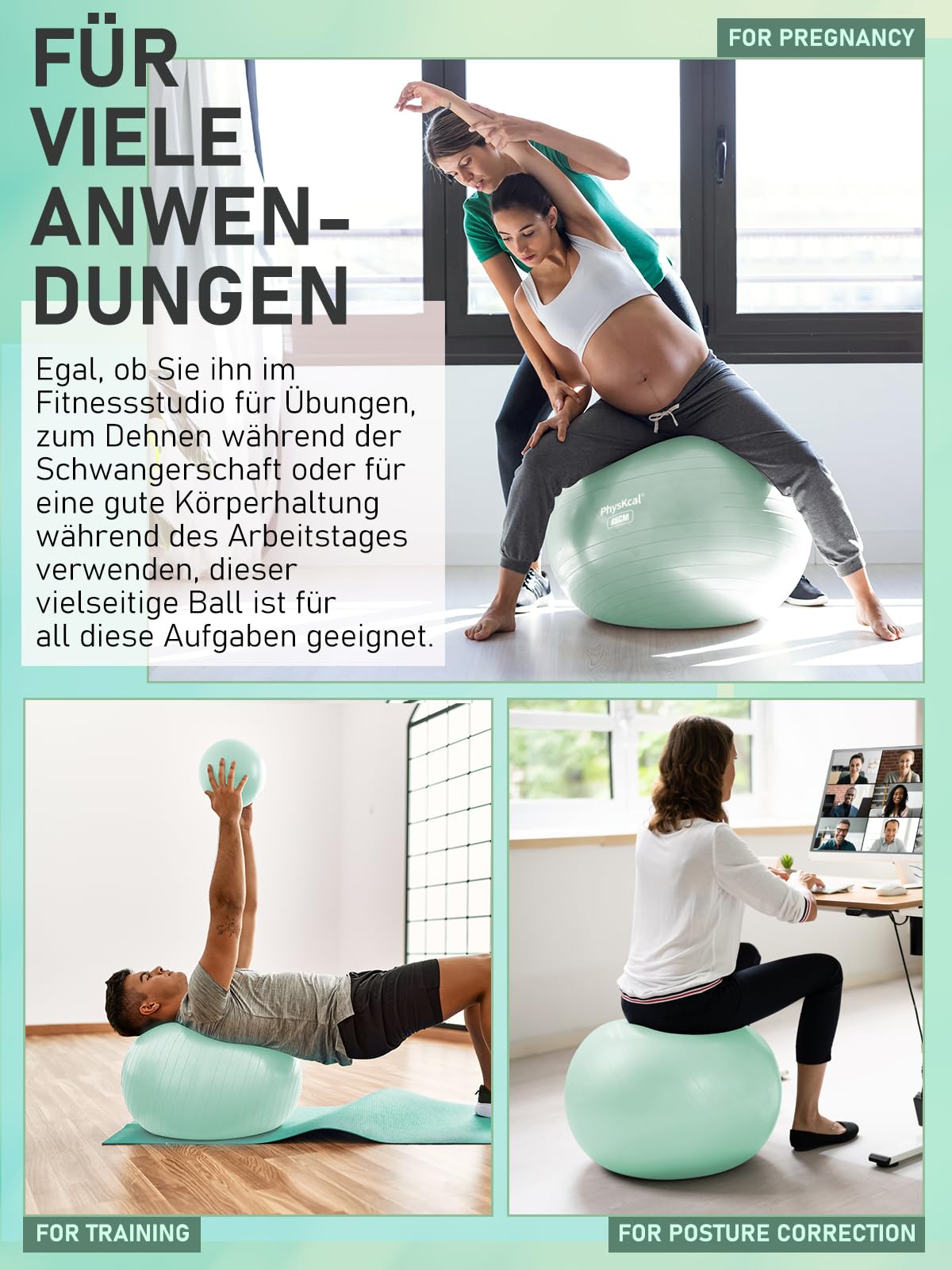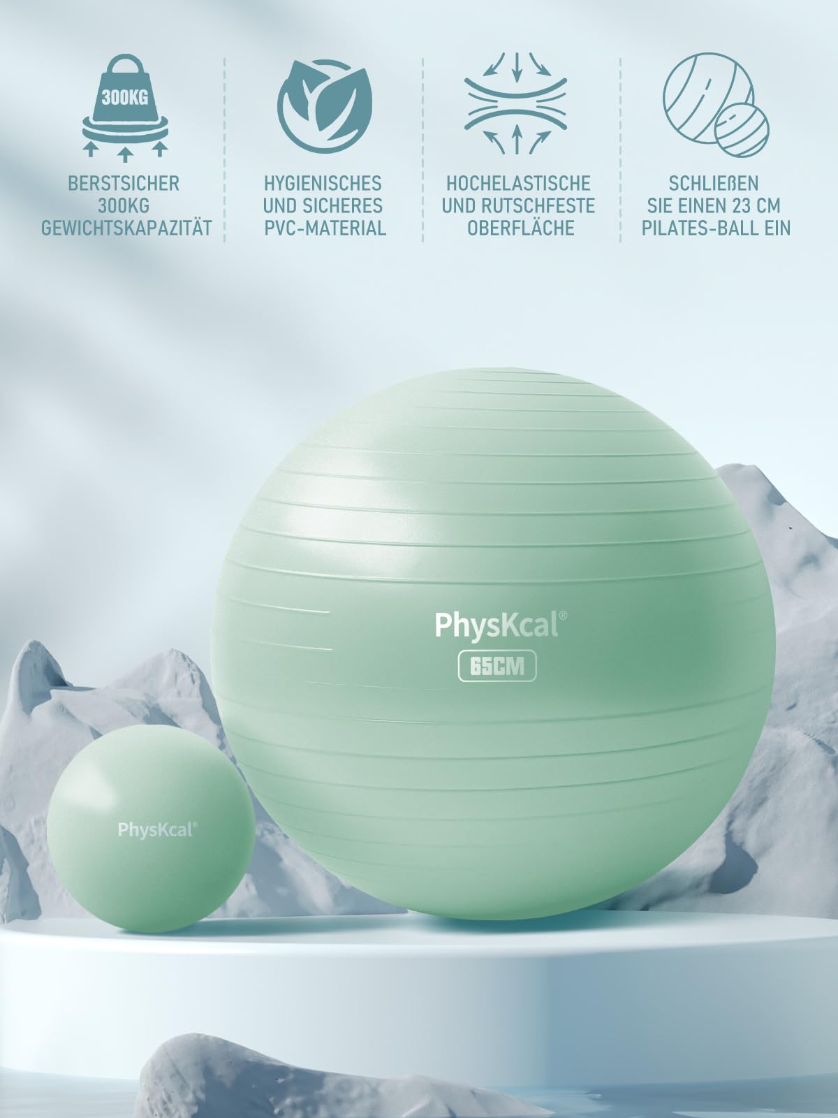 - 🤍𝗔𝗡𝗧𝗜-𝗕𝗨𝗥𝗦𝗧, 𝗥𝗨𝗧𝗦𝗖𝗛𝗙𝗘𝗦𝗧- PhysKcal vingrošanas bumba atbalsta līdz 300 kg/660 mārciņu dinamisko slodzi (2000 mārciņas statiskai slodzei), jo tā ir izgatavota no pietiekami daudz augstas kvalitātes PVC materiāla, lai tā lēnām iztukšotos, nevis pārsprāgtu. Matētā virsma un pretslīdes gredzeni ap bumbu nodrošina labāku saķeri treniņa laikā, lai veicinātu līdzsvaru un novērstu tās aizripošanu.