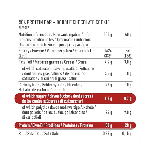-  Augstākās uzturvērtības: Viens 40 g batoniņš satur 20 g olbaltumvielu (kas atbilst augstam olbaltumvielu saturam 50 procenti) un tikai 0,7 g cukura (zems cukura saturs).