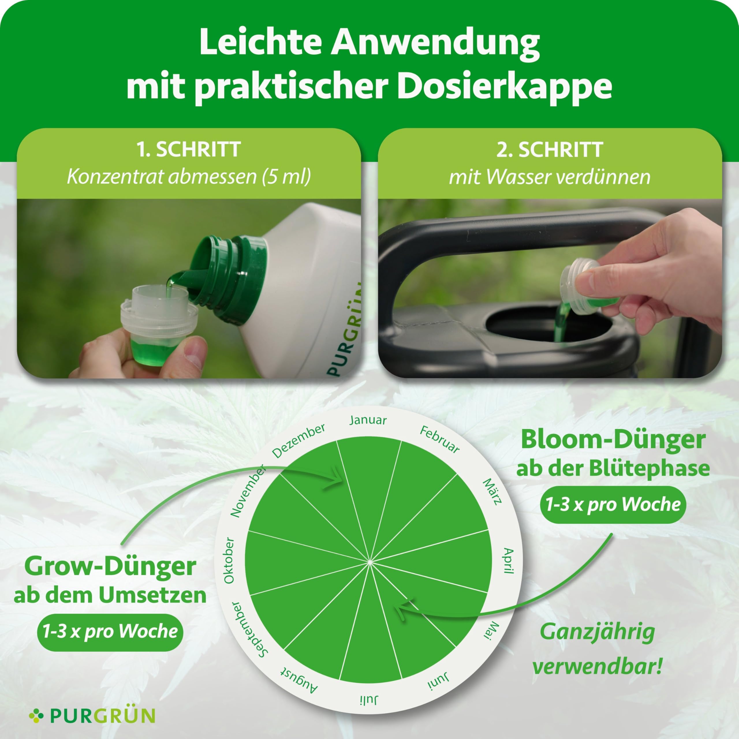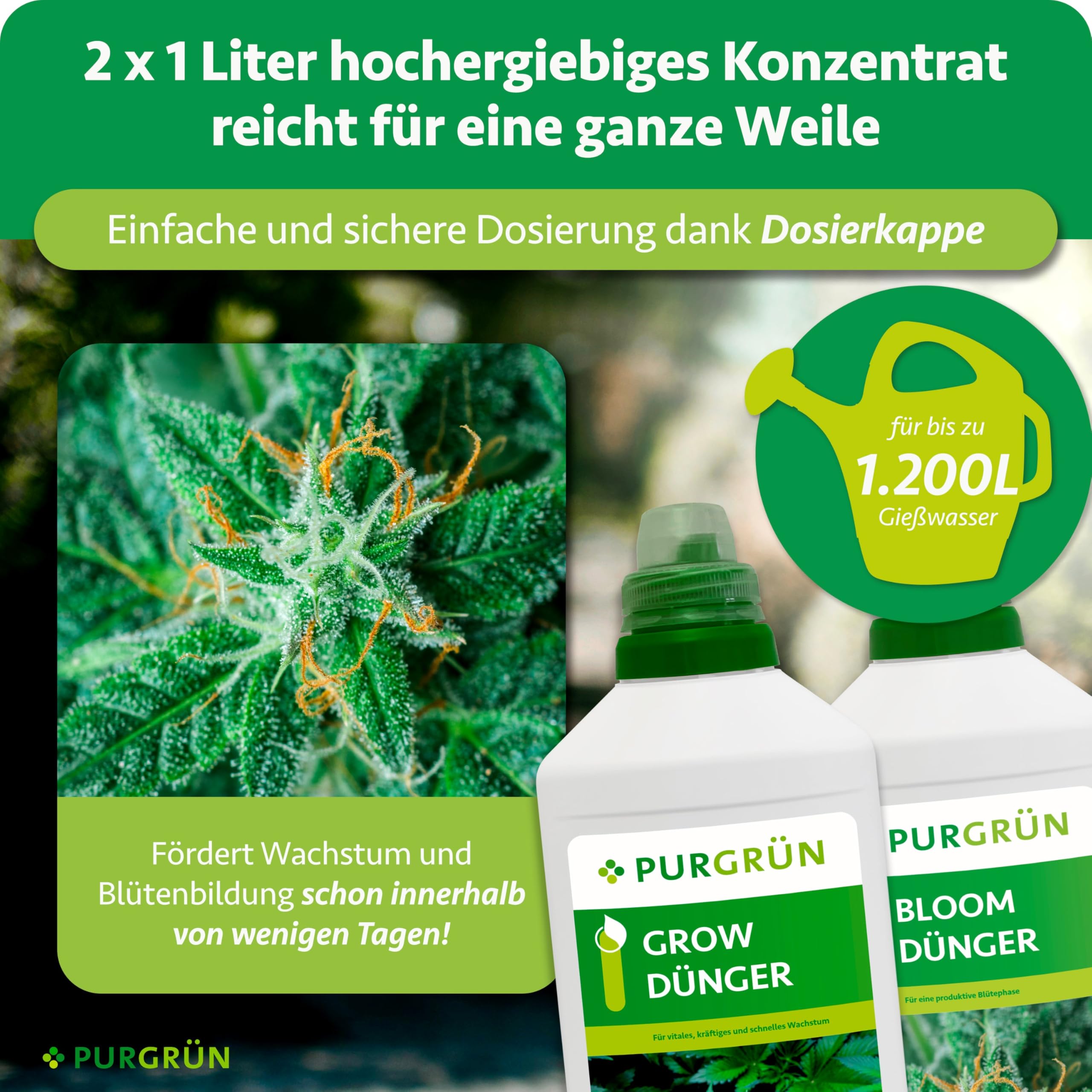 Purgrün® kaņepju mēslojuma komplekts 2 x 1 litrs – Ātras iedarbības minerālu formula – Pilna spektra barības vielas augšanai un ziedēšanai – Šķidrs mēslojums lietošanai iekštelpās un ārā – Automātiski ziedošām, sativu un indica šķirnēm