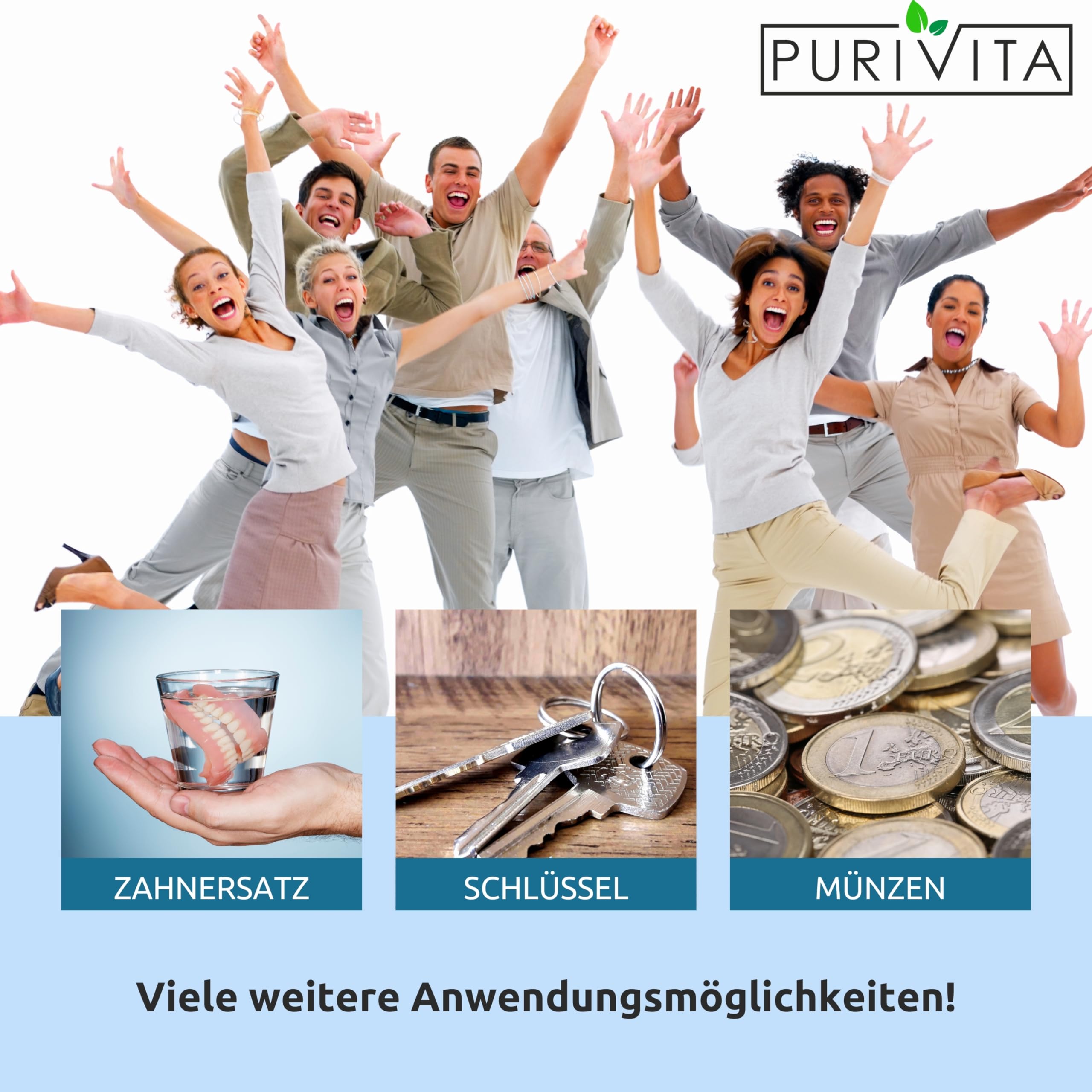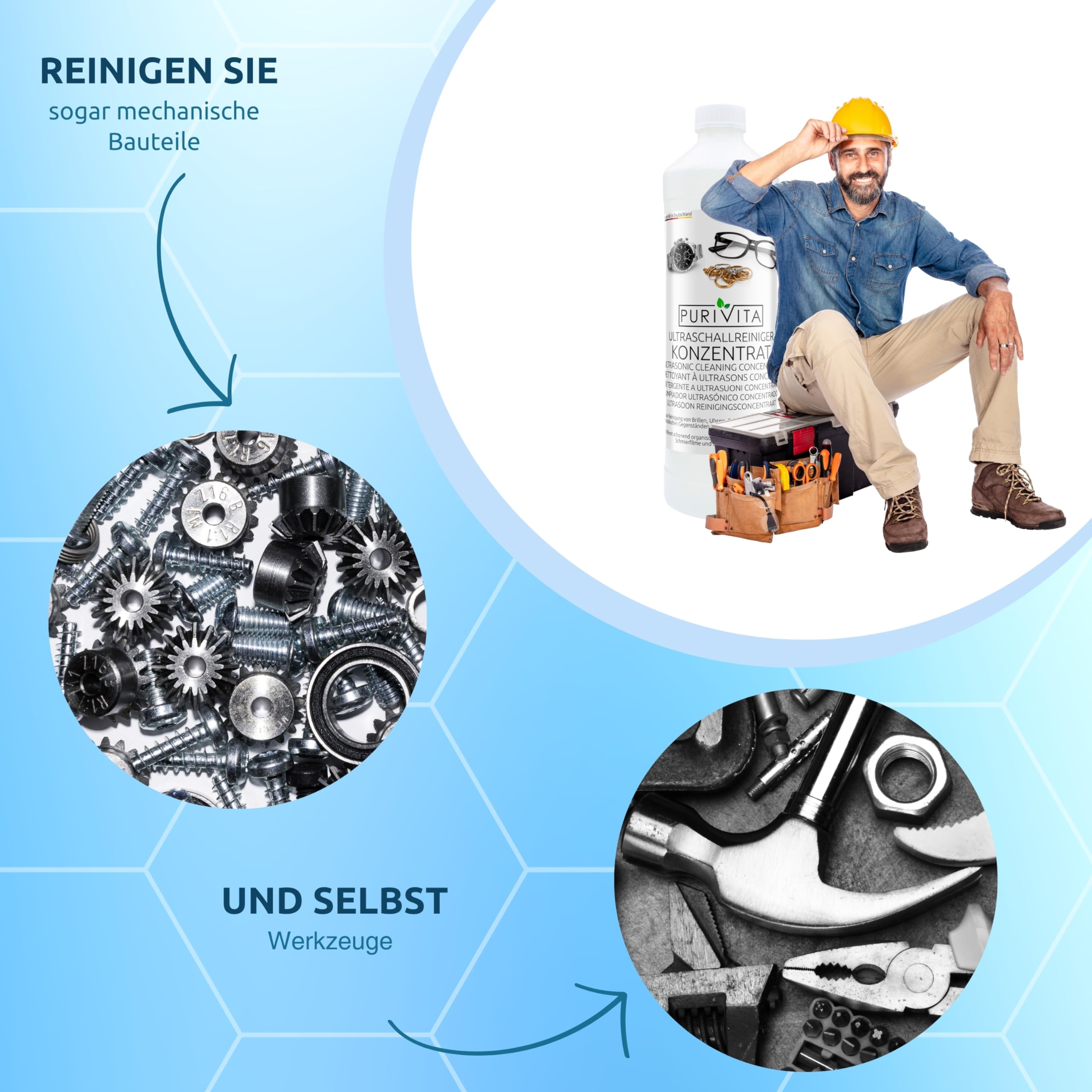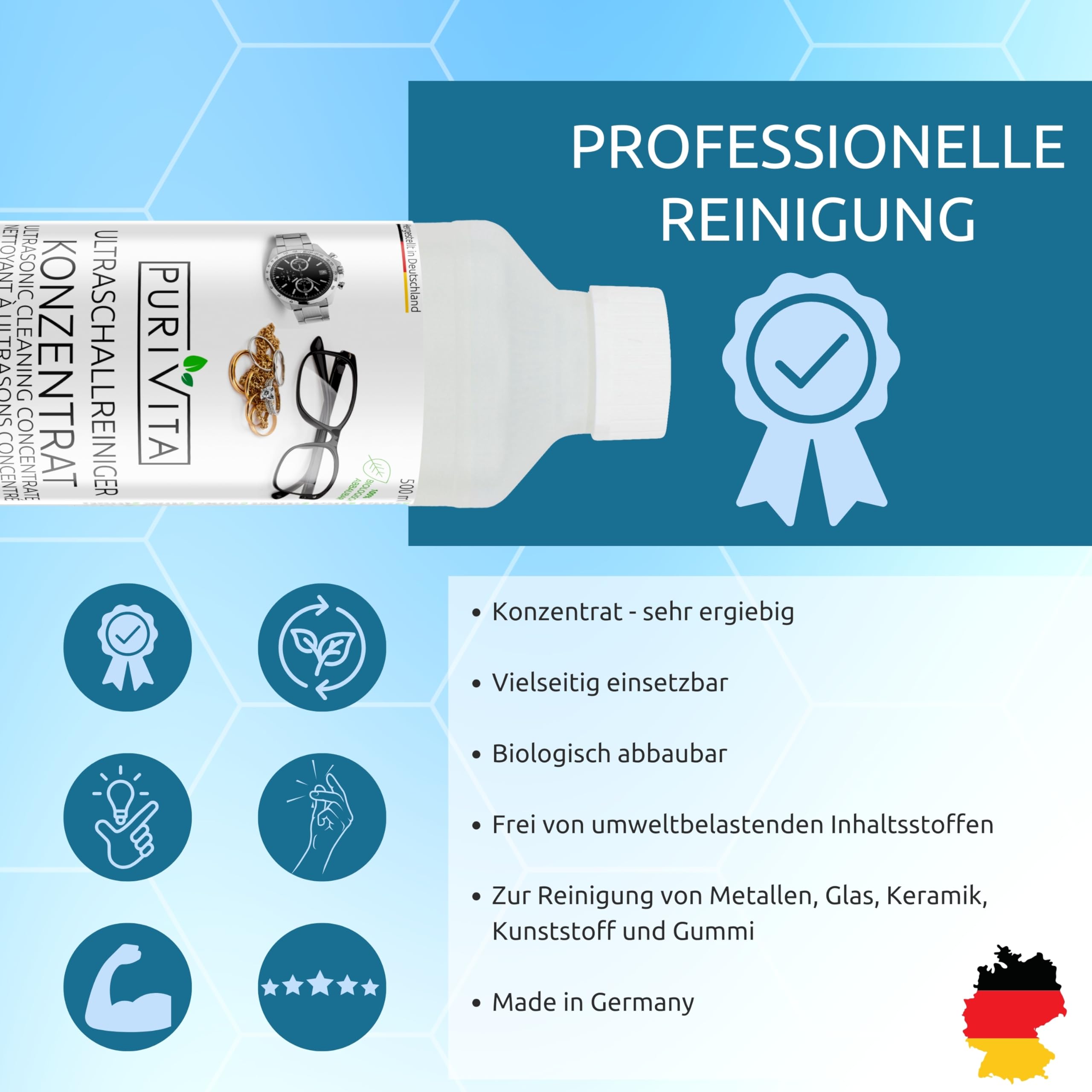 PURIVITA® ultraskaņas tīrīšanas koncentrāts [500 ml] - tīrīšanas līdzeklis ultraskaņas ierīcēm - tīrīšanas šķidrums ultraskaņas tīrītājiem - ultraskaņas tīrīšana brillēm, rotaslietām, zobiem un monētām