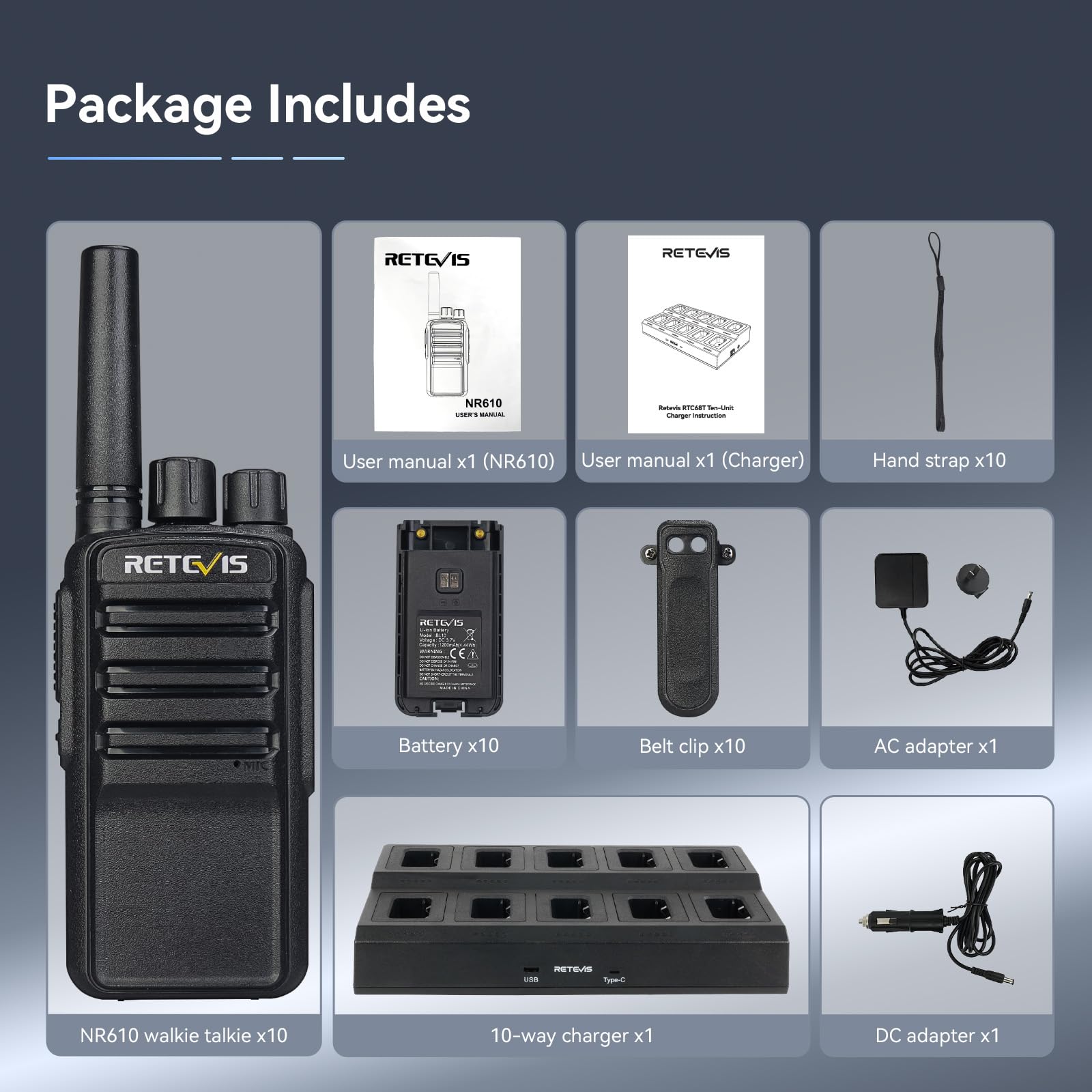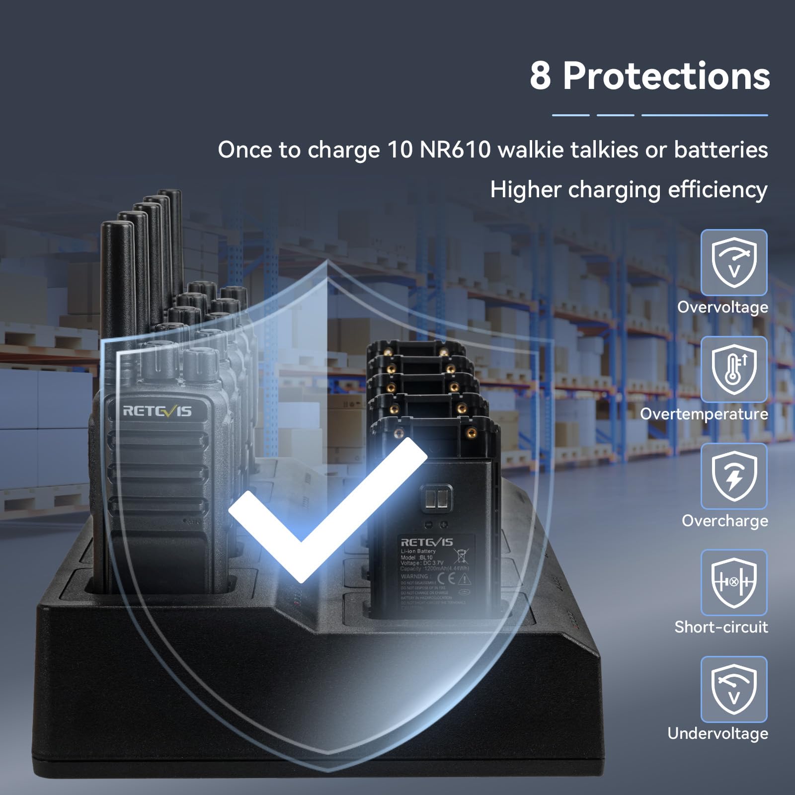 - Efektīva uzlāde; 10 kontaktu lādētājs vienlaikus uzlādē 10 NR610 radioaparātus un akumulatorus; palīdz uzlabot uzlādes efektivitāti un ātri paveikt darbu