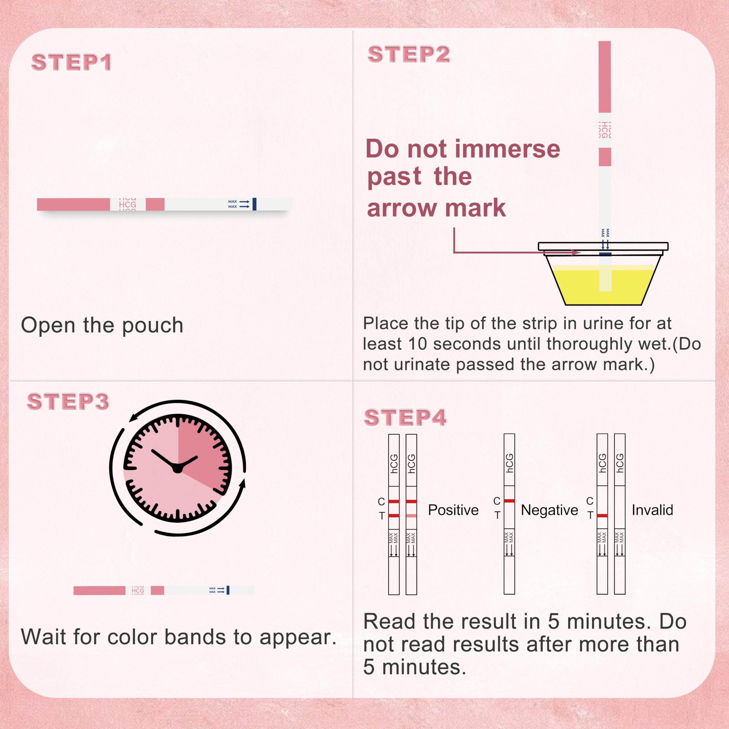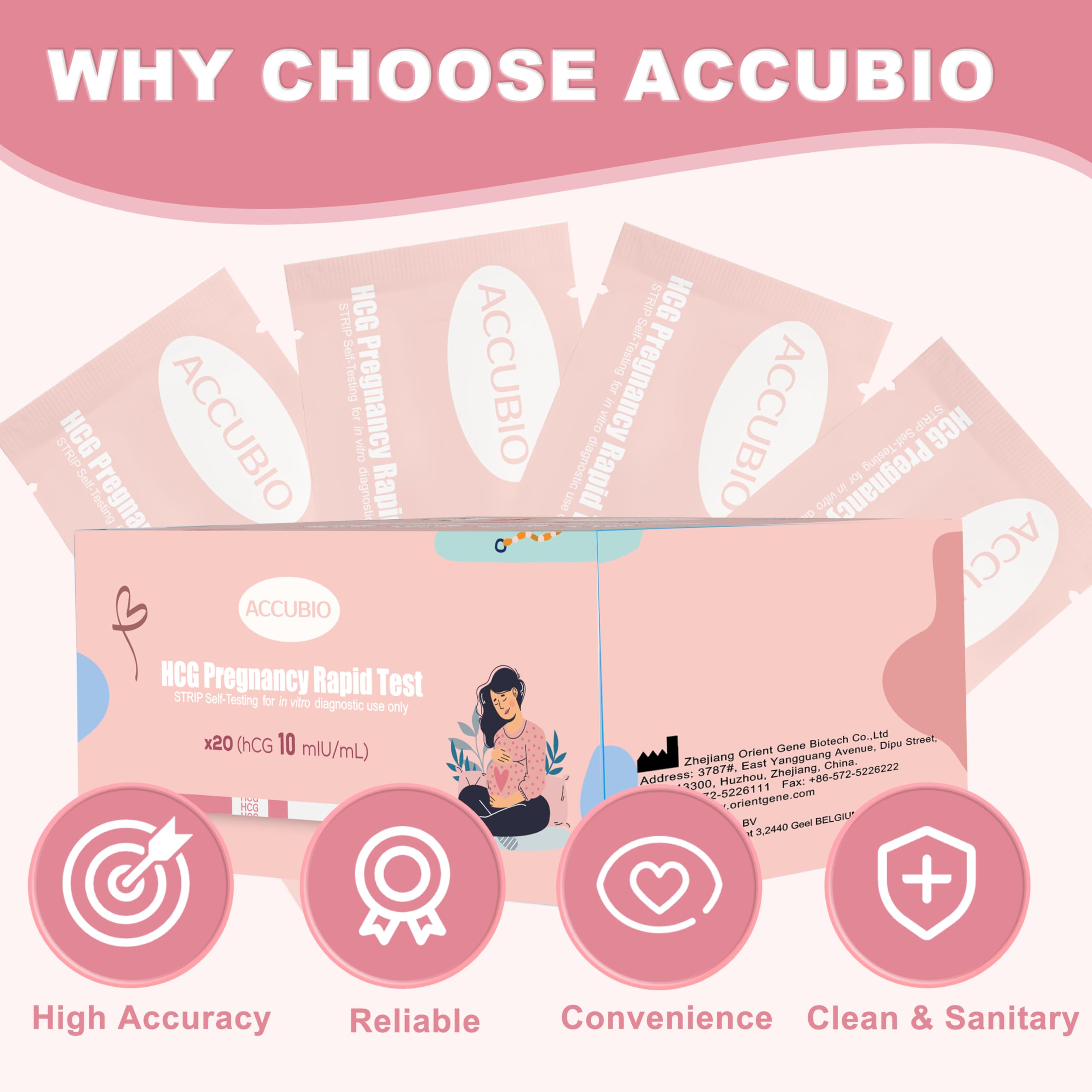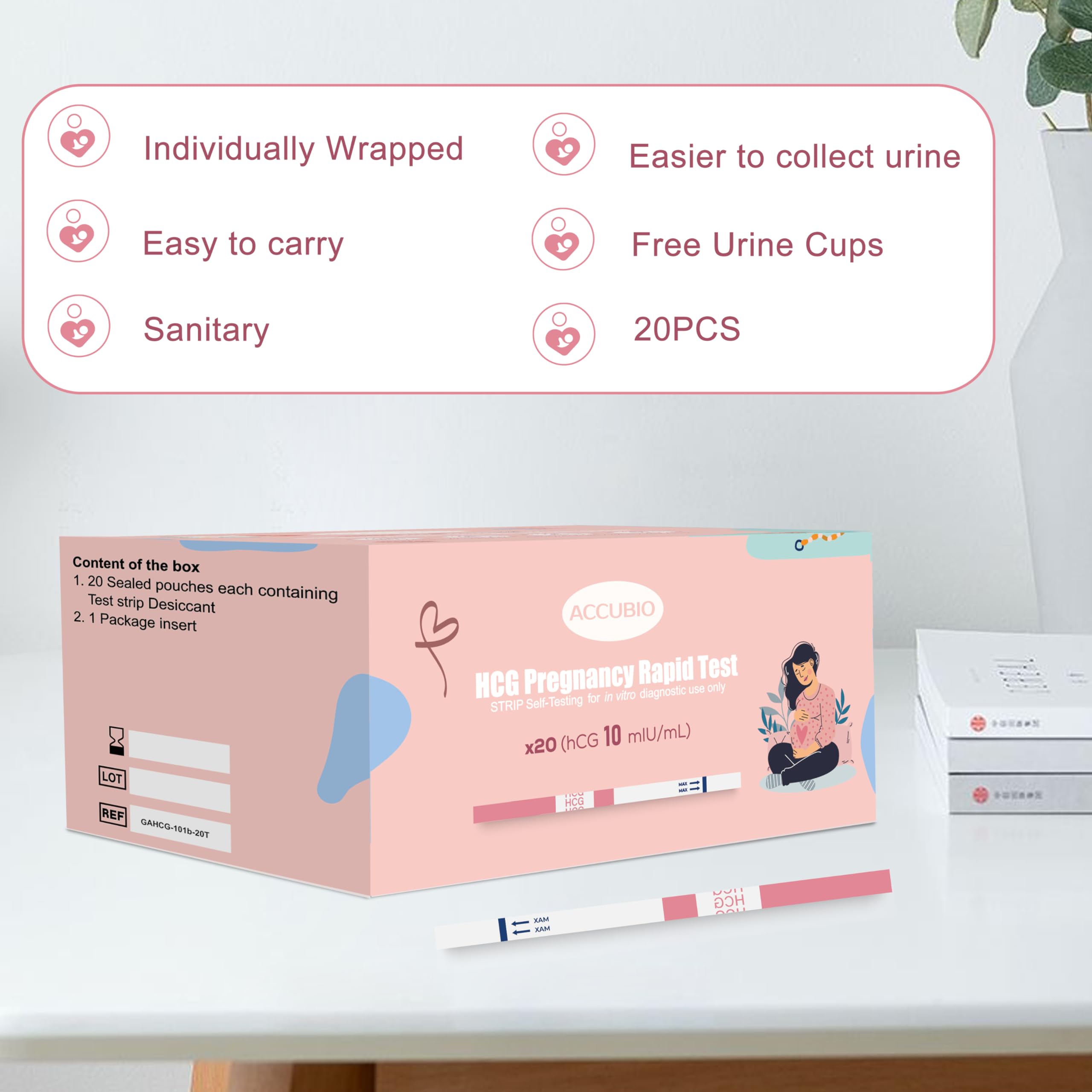 Grūtniecības testa strēmeles, hCG grūtniecības tests lietošanai mājās agrīnai noteikšanai, precīzs vairāk nekā 99%, 20 gabali atsevišķi iesaiņoti ar urīna pārbaudes krūzītēm, grūtniecības testi 5 mm plati, 10 mSV/ml