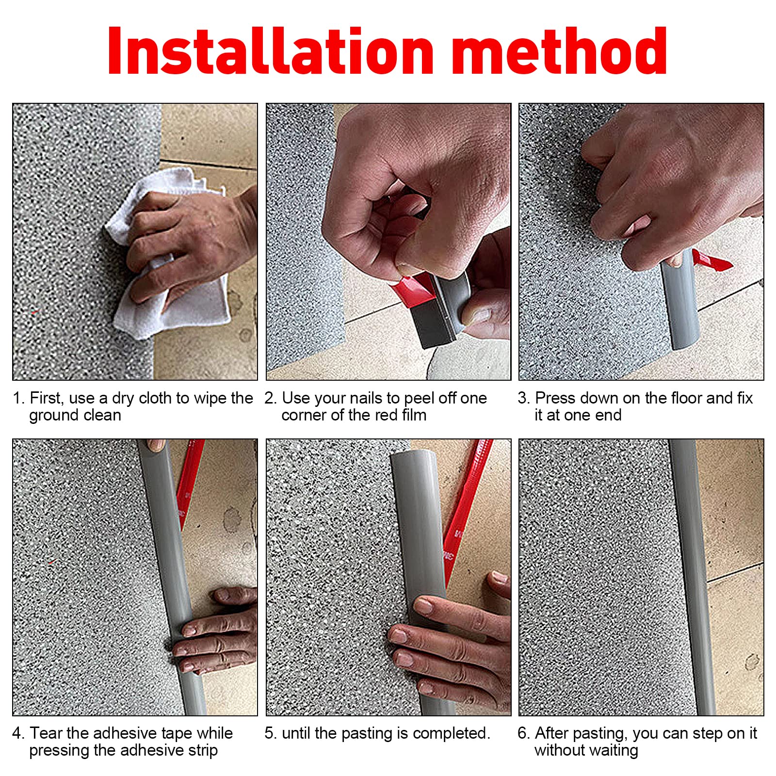 【Pašlīmējošs dizains】 - Mūsu durvju sliekšņa rampa ir pašlīmējoša, un tās aizmugurē ir ūdensnecaurlaidīga līmlente, ko var uzklāt, noņemot aizsargplēvi un nogriežot pārbaudītajā garumā. Pirms uzklāšanas, lūdzu, pārliecinieties, ka saskares virsma ir tīra un sausa.