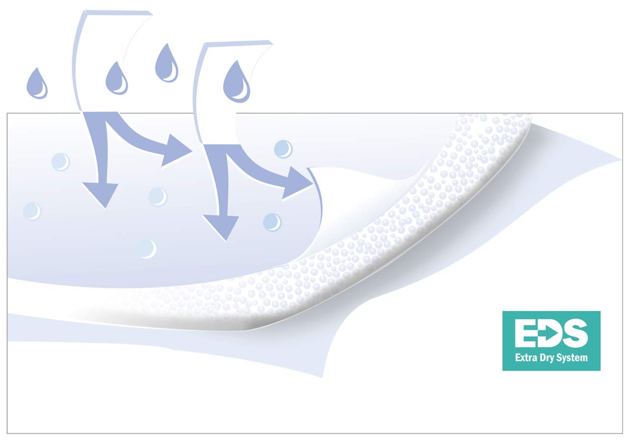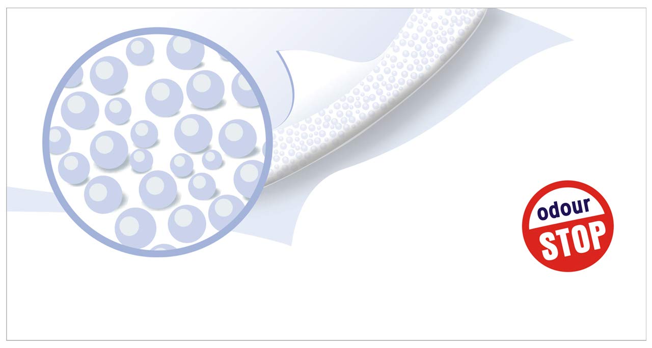 - Absorbējošs spilventiņš ar superabsorbentu - droši saistās ar šķidrumiem un neitralizē smakas, paaugstināta aizsardzība īpaši aktīviem cilvēkiem