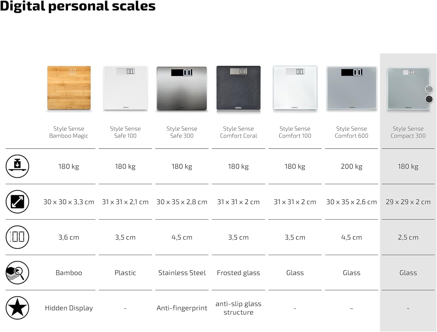 Īsts dārgakmens. Elegantais sudraba un stikla dizains piešķir Style Sense Compact 300 digitālajiem vannas istabas svariem izcilu izskatu jebkurā vannas istabā. Tā pakāpiena virsma, kas izgatavota no augstas kvalitātes drošības stikla, nodrošina ērtu stāvēšanu un iztur svaru līdz 180 kg. Jūsu personīgo ķermeņa svaru var nolasīt ar precīziem 100 g soļiem viegli nolasāmā LCD displejā. Ērto lietošanu apliecina arī integrētā ieslēgšanas/izslēgšanas funkcija: svari ieslēdzas, tiklīdz uz tiem uzkāpjat, un automātiski izslēdzas pēc svēršanas. Tas padara to enerģijas taupošu un ļauj ilgstoši lietot komplektā iekļautās baterijas. Bateriju nodalījums ir aizskrūvēts, nodrošinot mazo drošību.
