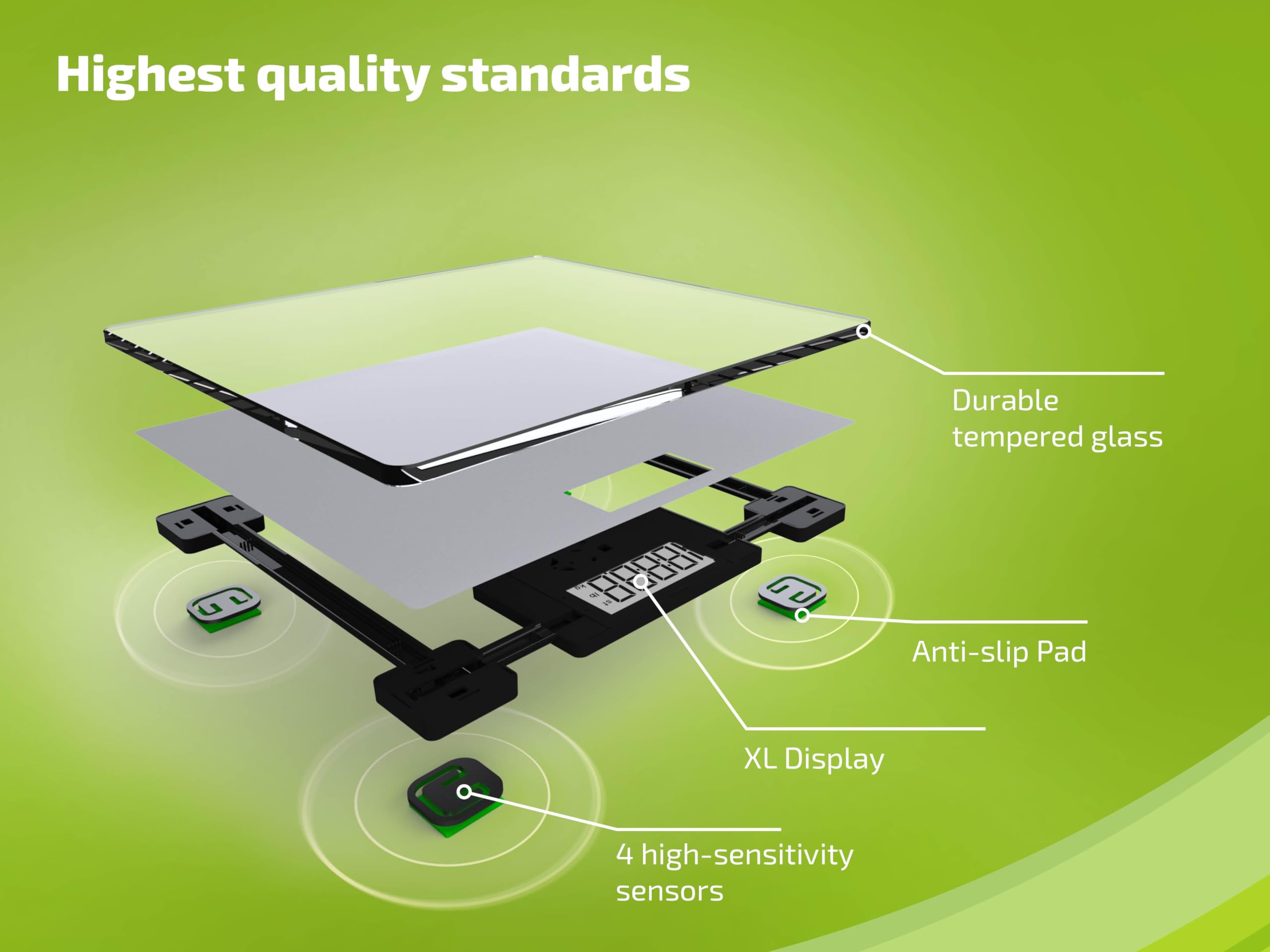 - Droša lietošana — pateicoties īpaši plakanajam dizainam, digitālie svari piedāvā īpaši drošu statīvu un tos var viegli uzglabāt zem skapja vai plaukta.