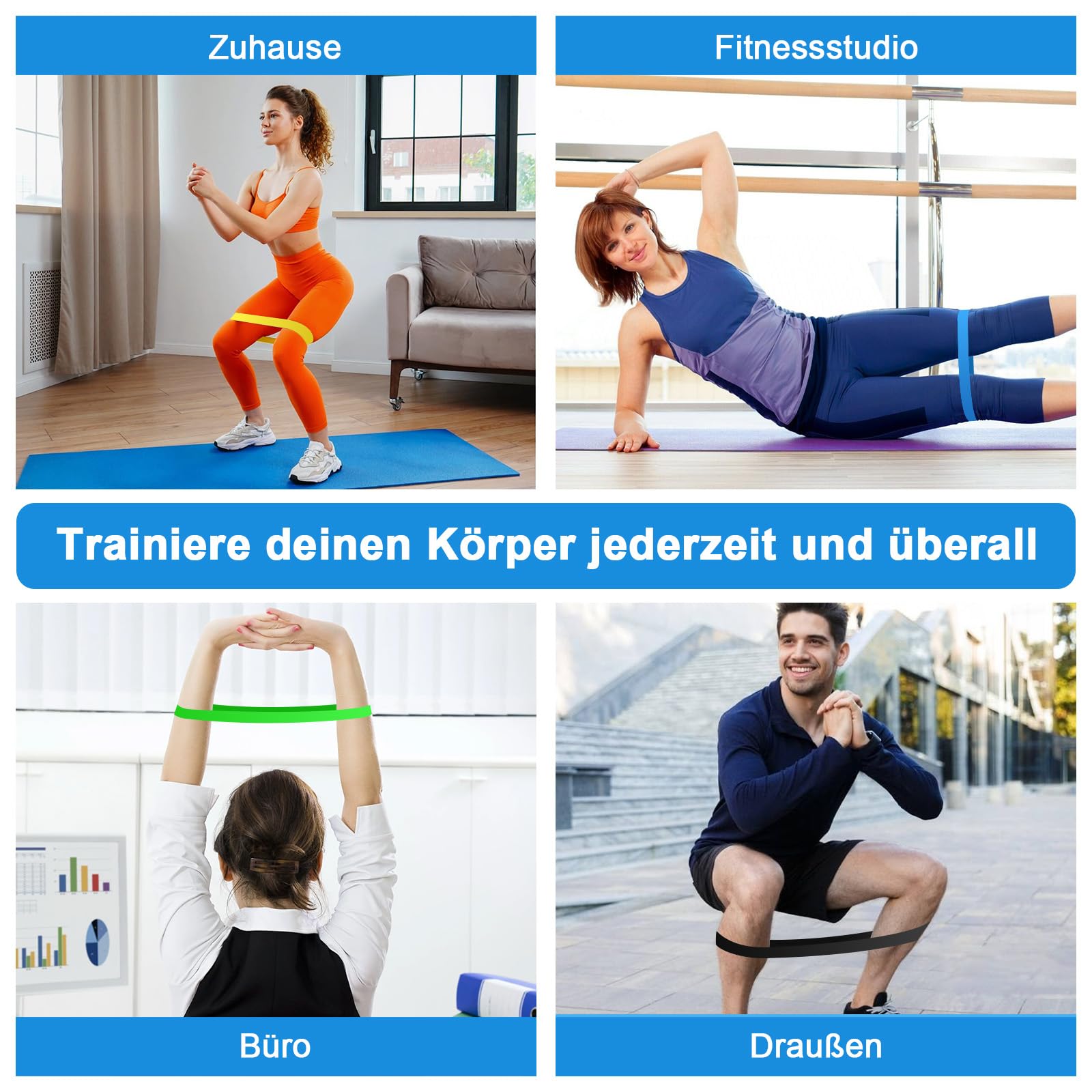 - Daudzpusīgs komplekts ar 5 pretestības līmeņiem: Šajā komplektā ietilpst 5 vingrošanas lentes ar dažādu izturību, kas ir ideāli piemērotas iesācējiem, kuri sāk veikt pamata vingrinājumus, vai ekspertiem, kuri gatavojas intensīvam treniņam. Pateicoties iekļautajai somai, sporta aproci var ņemt līdzi, lai kurp jūs dotos. Izmantojiet iekļautās instrukcijas pamata vingrinājumiem vai meklējiet tiešsaistē detalizētus video par padziļinātiem treniņiem.