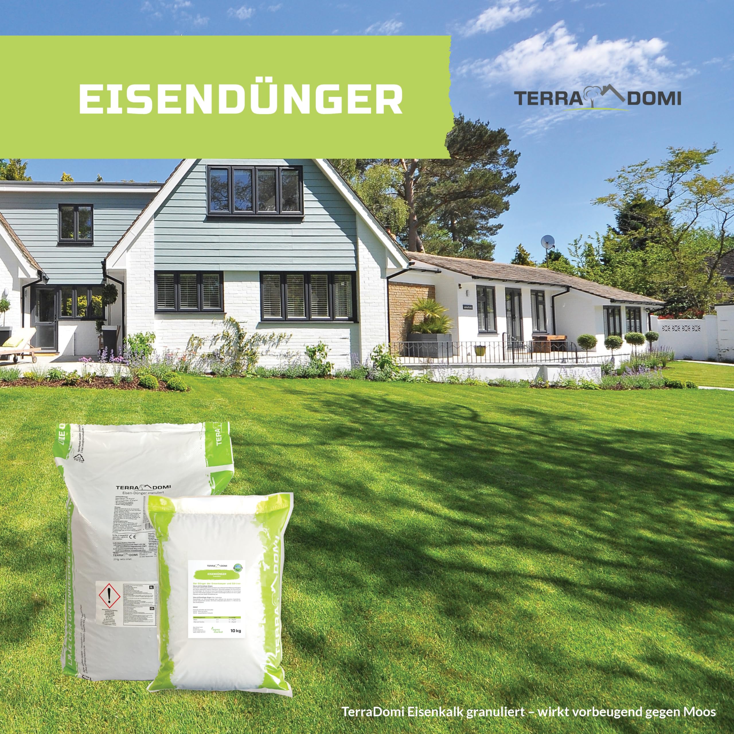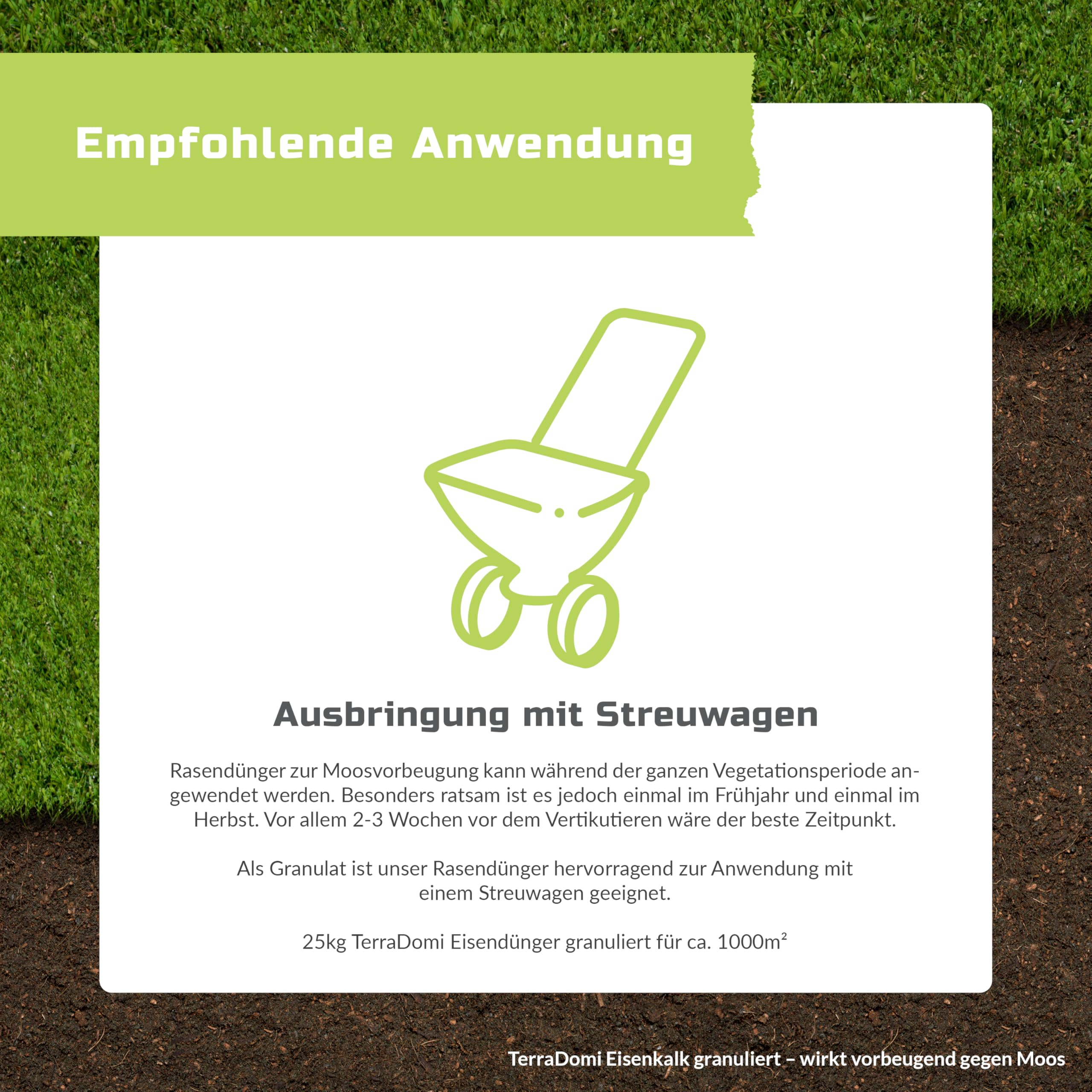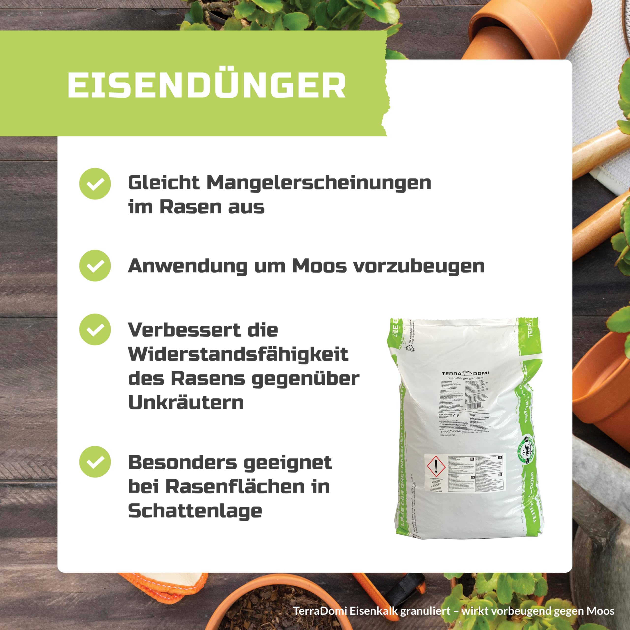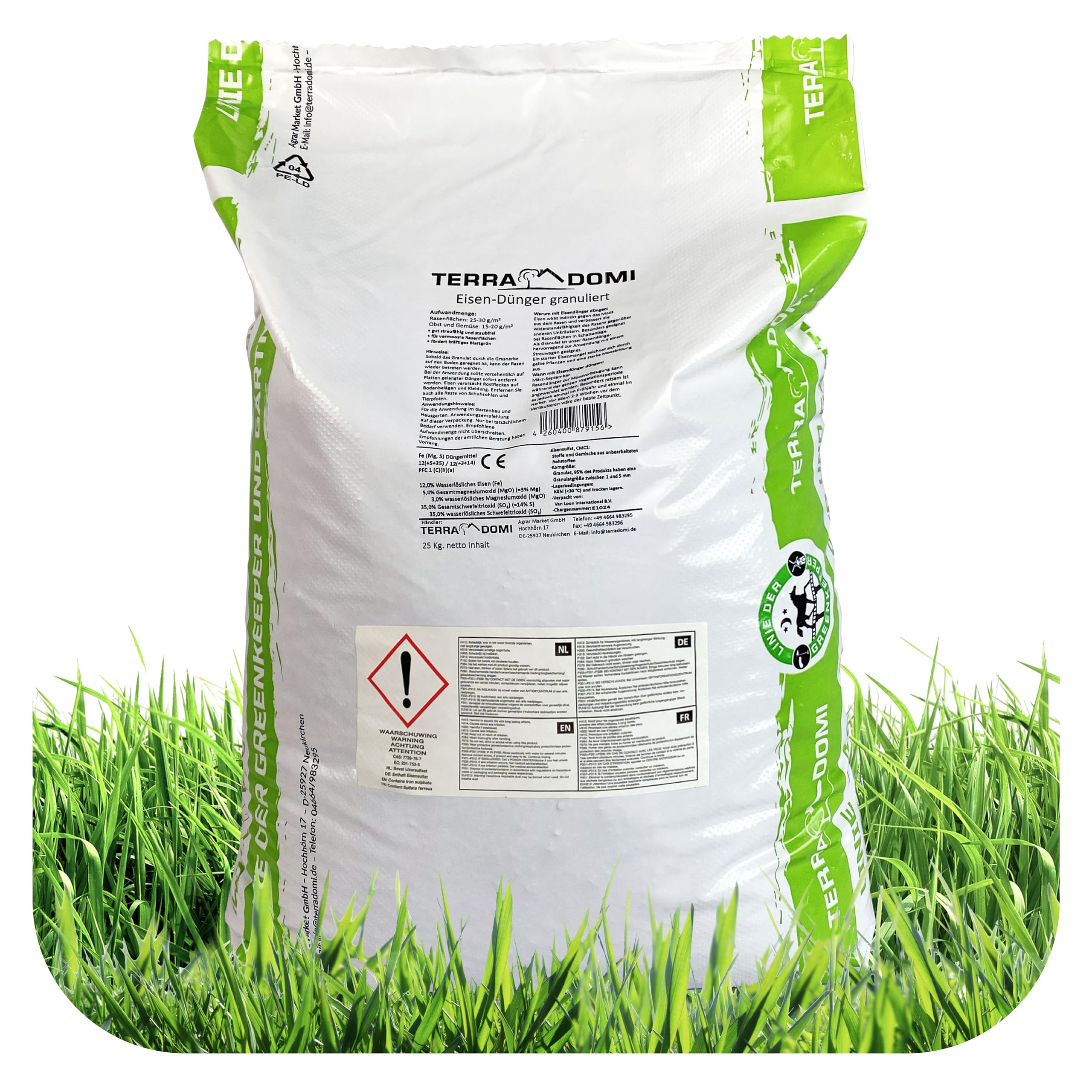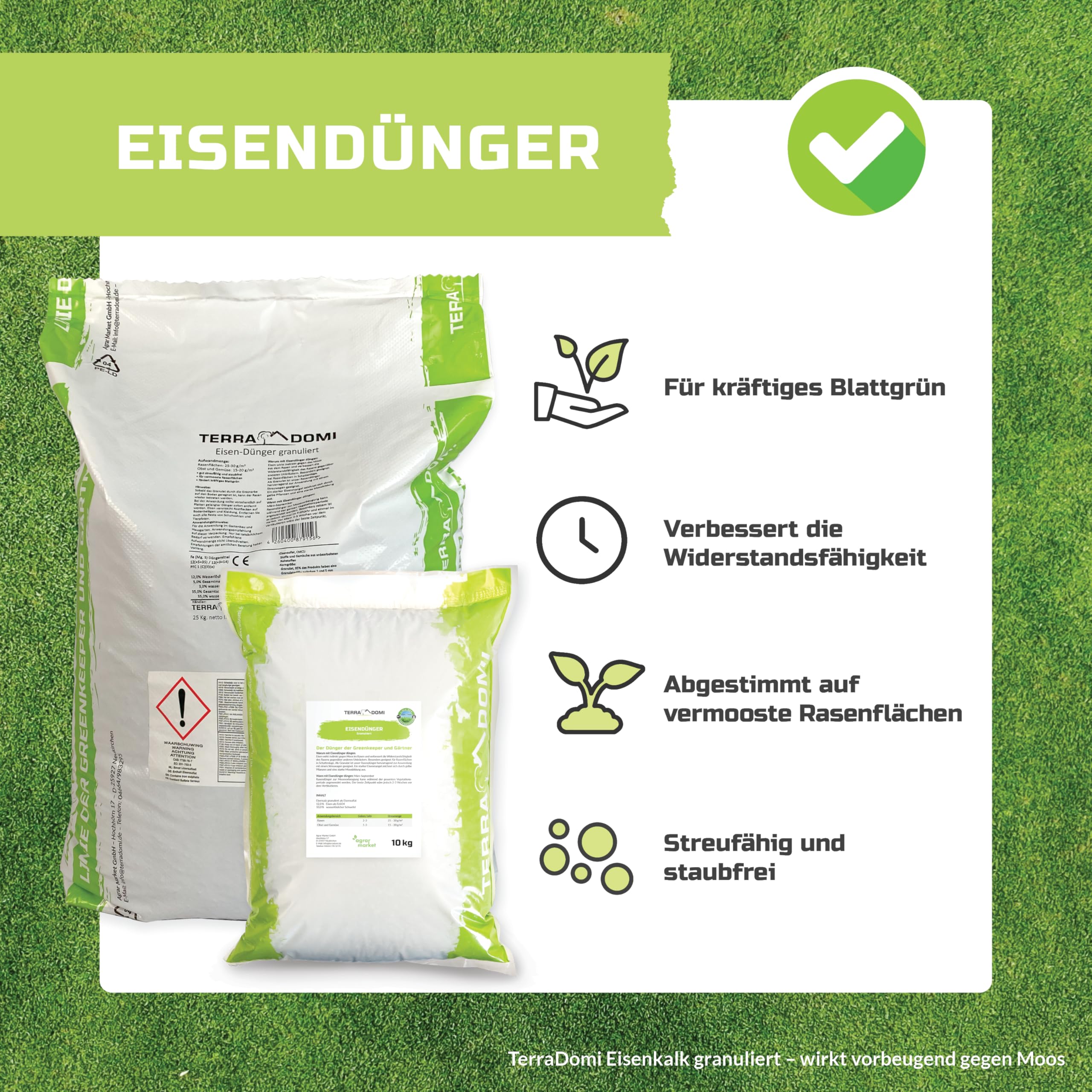 TerraDomi dzelzs mēslojums 25 kg apm. 1000 m² | Turbomēslojums, kas pielāgots zālieniem ar sūnām | Granulēts, piemērots izkliedētājiem un bez putekļiem