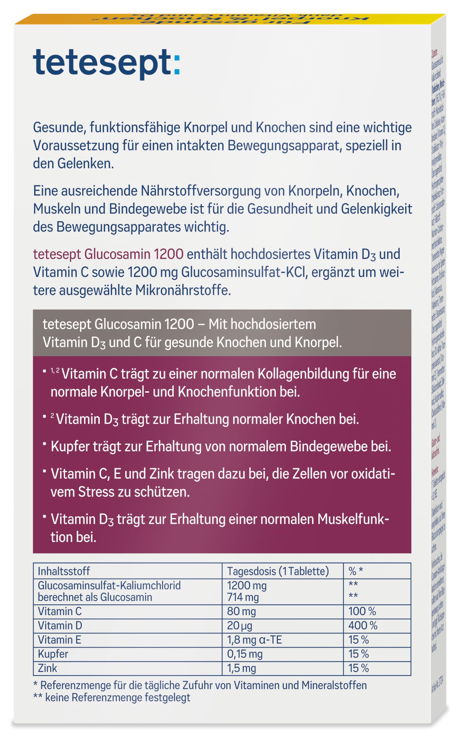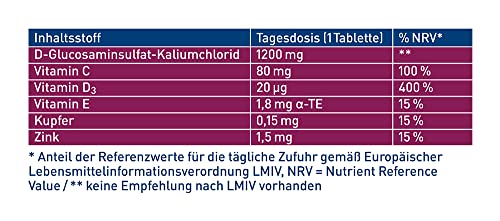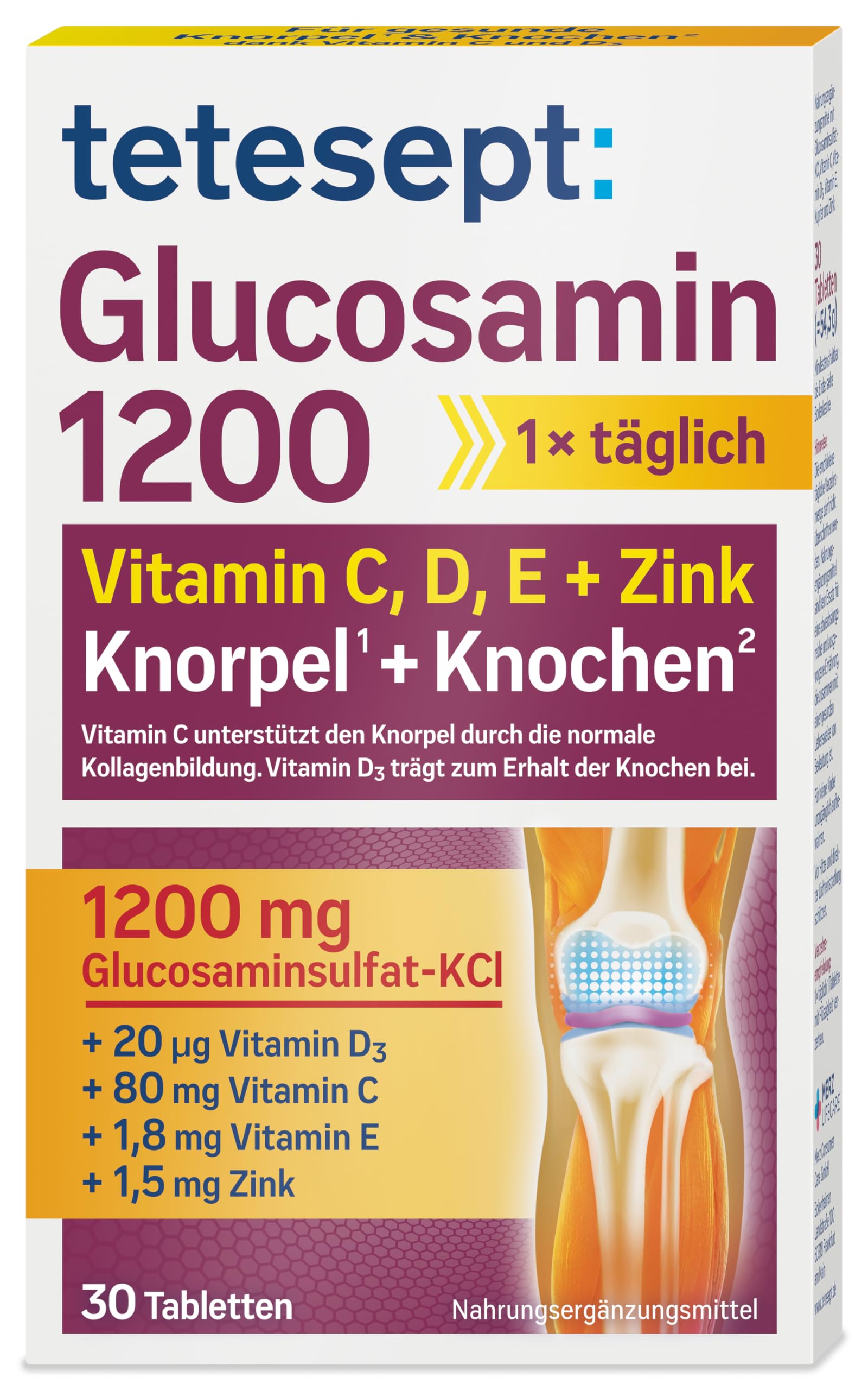 - Piegādes apjoms: 1 x 30 tabletes Glikozamīns 1200 no tetesept / Uzturvielas skrimšļiem, kauliem, saistaudiem un muskuļiem - ar glikozamīna sulfātu KCI, lielām C un D3 vitamīnu devām, E vitamīnu, cinku un varu