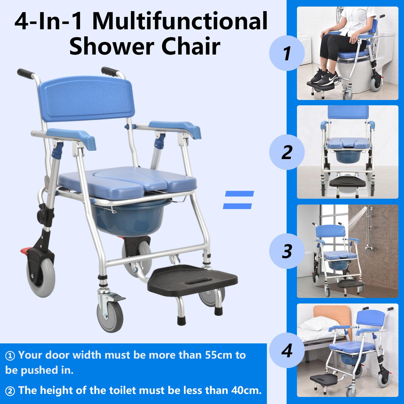 - 【Komforts un drošība】1. Salokāmais tualetes krēsls senioriem ir aprīkots ar mīkstu un ērtu ūdensnecaurlaidīgu spilvenu un salokāmu kājas pedāli; 2. Senioriem paredzētais dušas krēsls ar 4 neslīdošiem riteņiem ir aprīkots ar bremžu sistēmām, lai nodrošinātu stabilitāti un drošību pat uz slapjām grīdām.