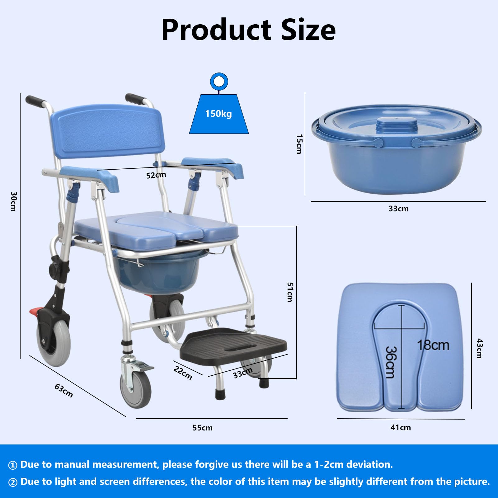 - 【Iepakojuma saraksts】Dušas krēsls ar riteņiem + urīna spainis + aksesuāri. 1. Durvju platumam jābūt lielākam par 55 cm. 2. Lietojot uz parastas tualetes, augstumam jābūt mazākam par 40 cm, un maksimālā slodzes izturība ir 150 kg. 3. Detalizēts produkta uzstādīšanas video ir augšupielādēts produkta saitē.