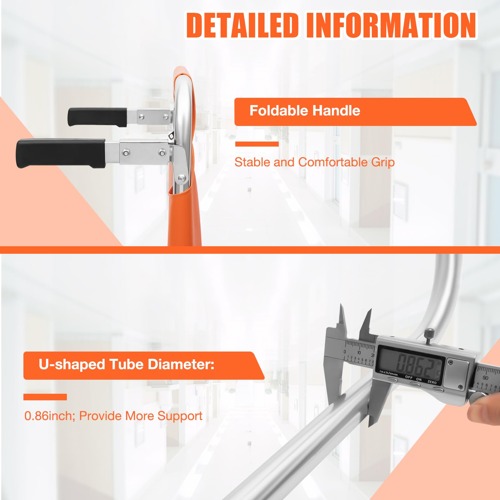 - Salokāmi rokturi: divi ergonomiskie rokturi kāpņu krēsla aizmugurē ir ietīti plastmasā un tos var viegli salocīt, lai nodrošinātu stabilu un ērtu satvērienu.