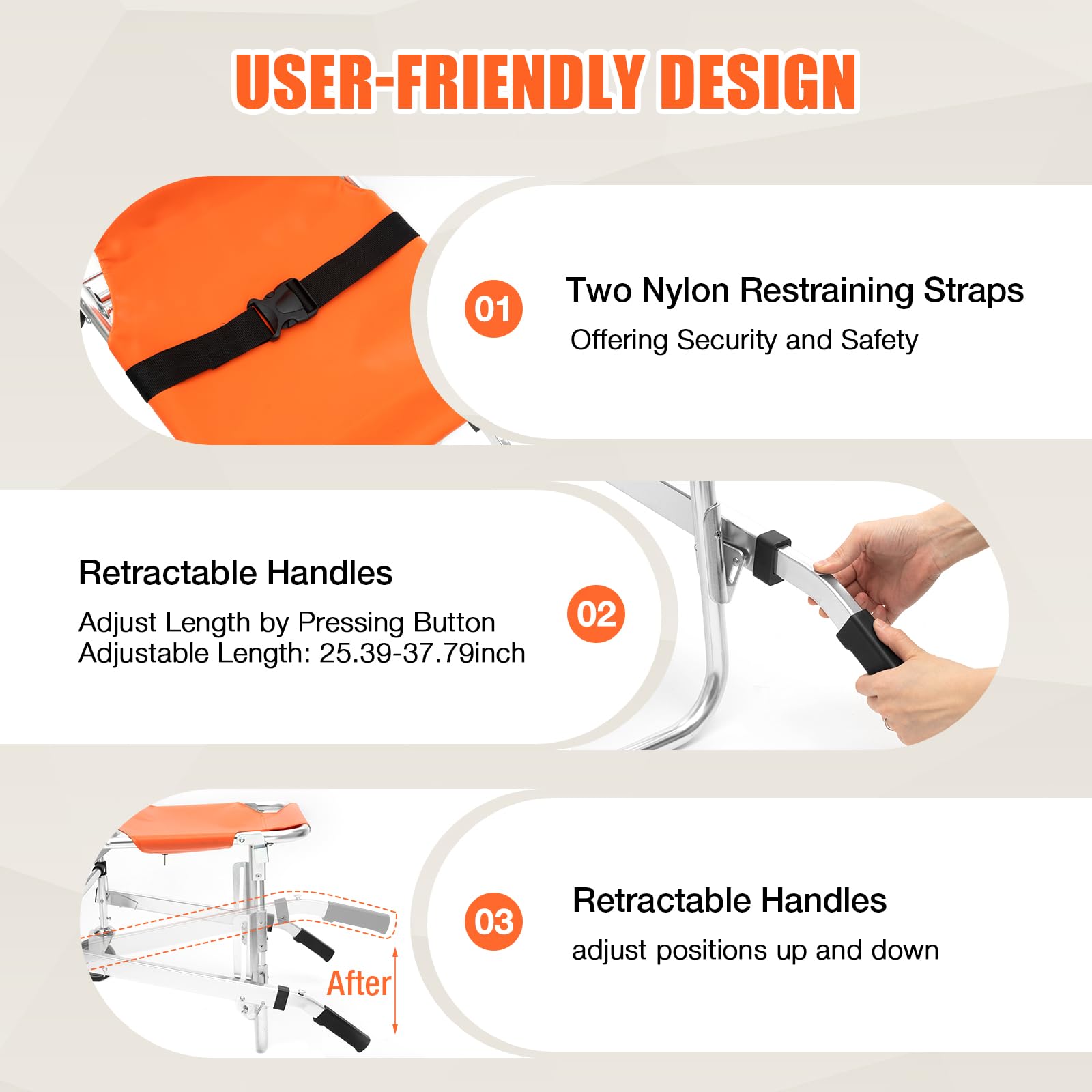 - Lietotājam draudzīgs dizains: tam ir divas regulējamas neilona siksnas ar plastmasas sprādzēm, kas var nodrošināt pacientu drošību transportēšanas laikā. Kāpņu krēsla priekšpusē esošie ievelkamie rokturi ir regulējami arī garumā un pozīcijā ar kloķi, kas ļauj ērti pacelt krēslu un nodrošina cilvēku drošību.