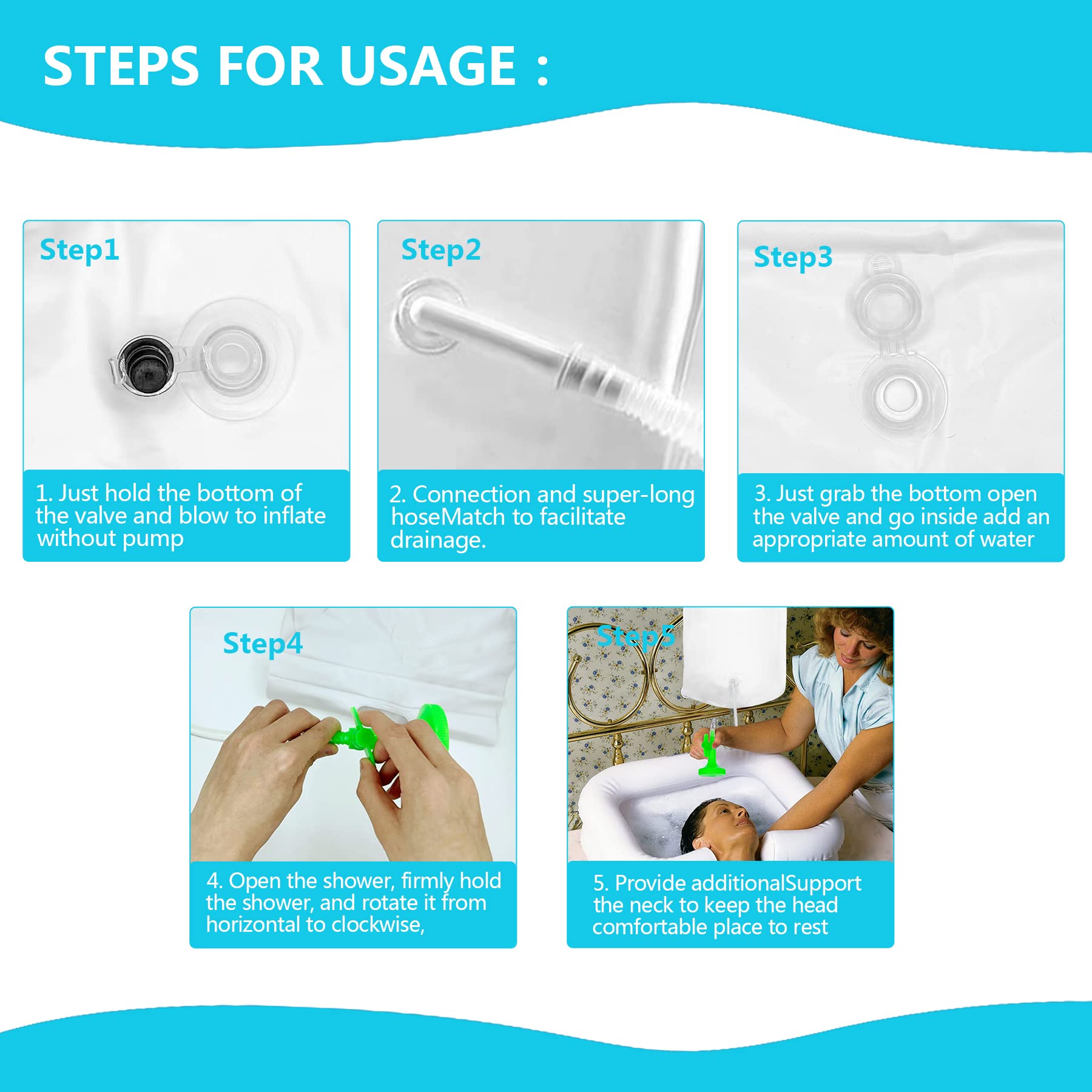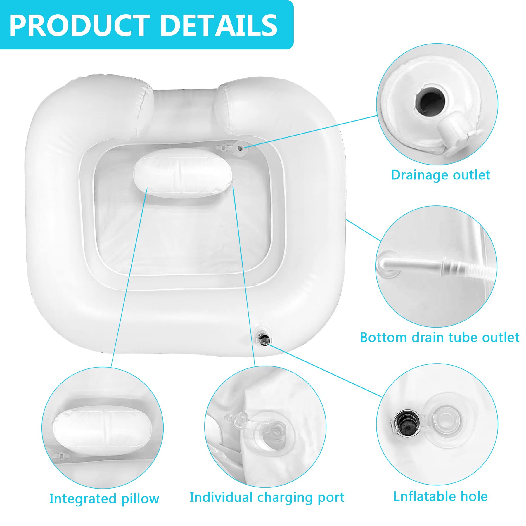 - 🚿【Lietotājam draudzīgs dizains】 Pārnēsājamajai šampūna izlietnei ir plata kakla atvere un integrēts galvas spilvens, kā arī tā ir aprīkota ar notekcauruli, ūdens maisiņu un dušas galviņu maksimālam komfortam un daudz vietas zem galvas. Divi slāņi un īpaši dziļa siena novērš ūdens izlīšanu lietošanas laikā.