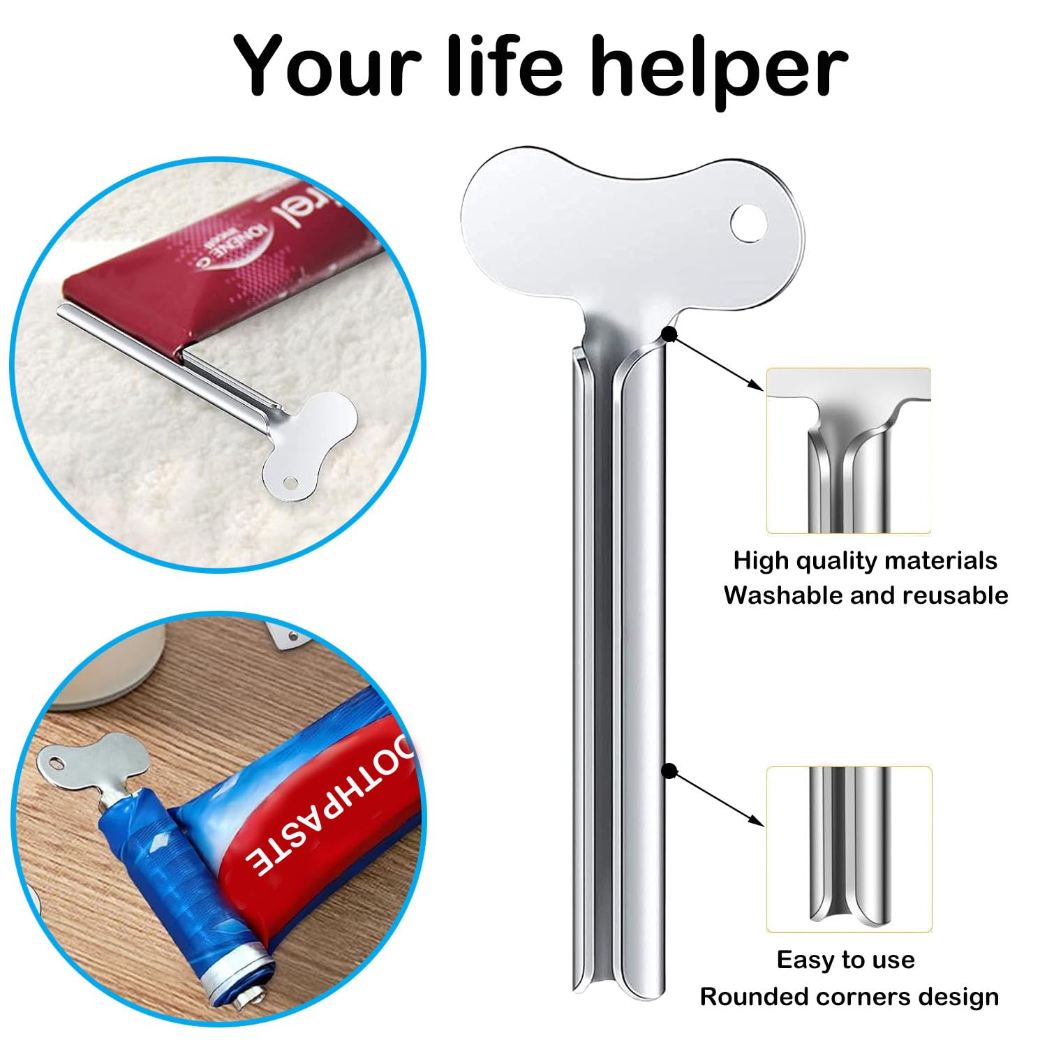 - 【Augstas kvalitātes nerūsējošā tērauda cauruļu spiede】 Zobu pastas spiede ir izgatavota no nerūsējošā tērauda, izturīga un ilgmūžīga, nav viegli sarūsējoša, to var atkārtoti izmantot daudzus gadus. Cauruļveida prese ir maza un vietu taupoša, un tās sānos ir caurumi ērtai uzglabāšanai.