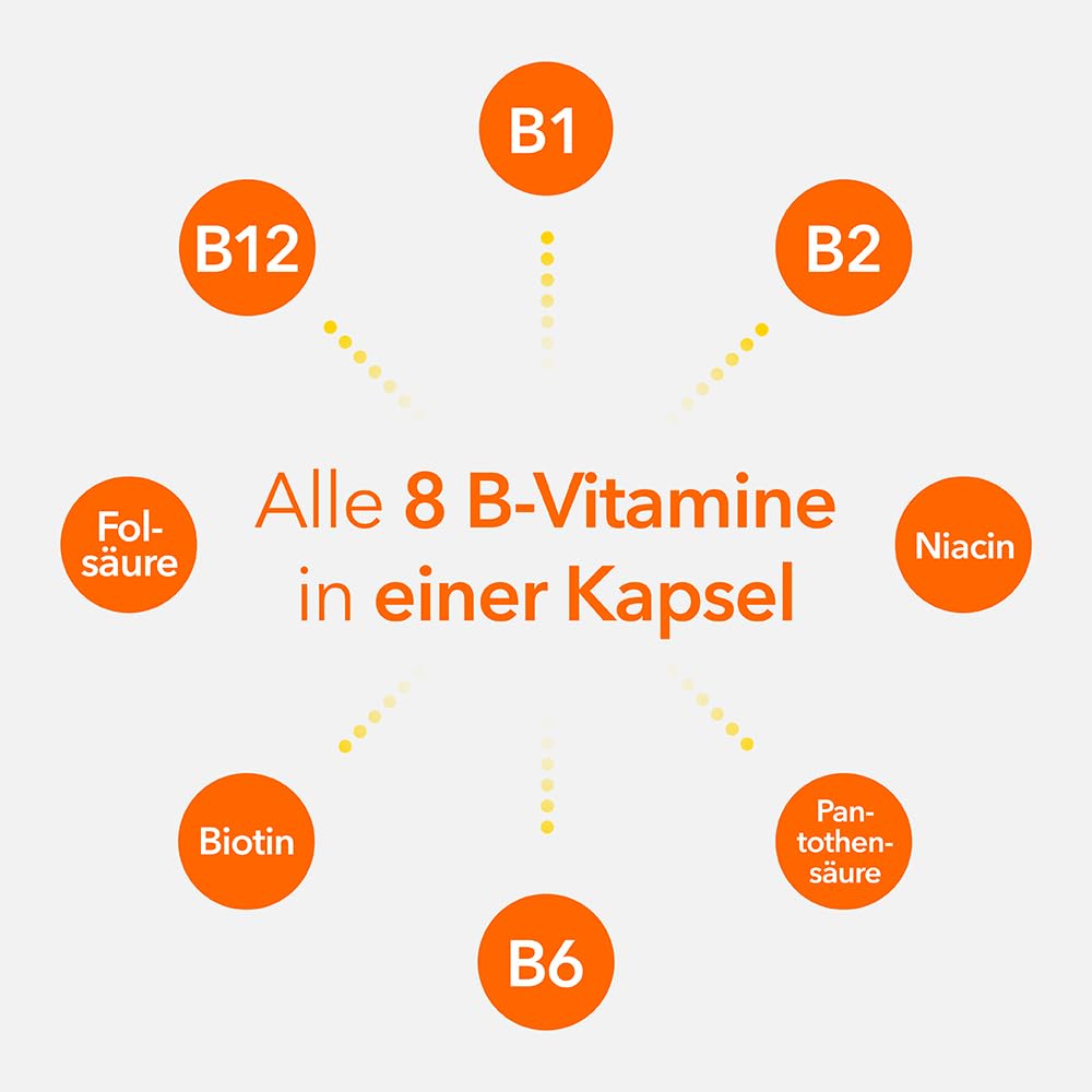 - B VITAMĪNU KOMPLEKSS: Cietās kapsulas satur B1 vitamīnu (tiamīnu), B2 vitamīnu (riboflavīnu), B3 vitamīnu (niacīnu), B5 vitamīnu (pantotēnskābi), B6 vitamīnu (piridoksīnu), B7 vitamīnu (biotīnu), B9 vitamīnu (folskābi) un B12 vitamīnu (cianokobalamīnu).