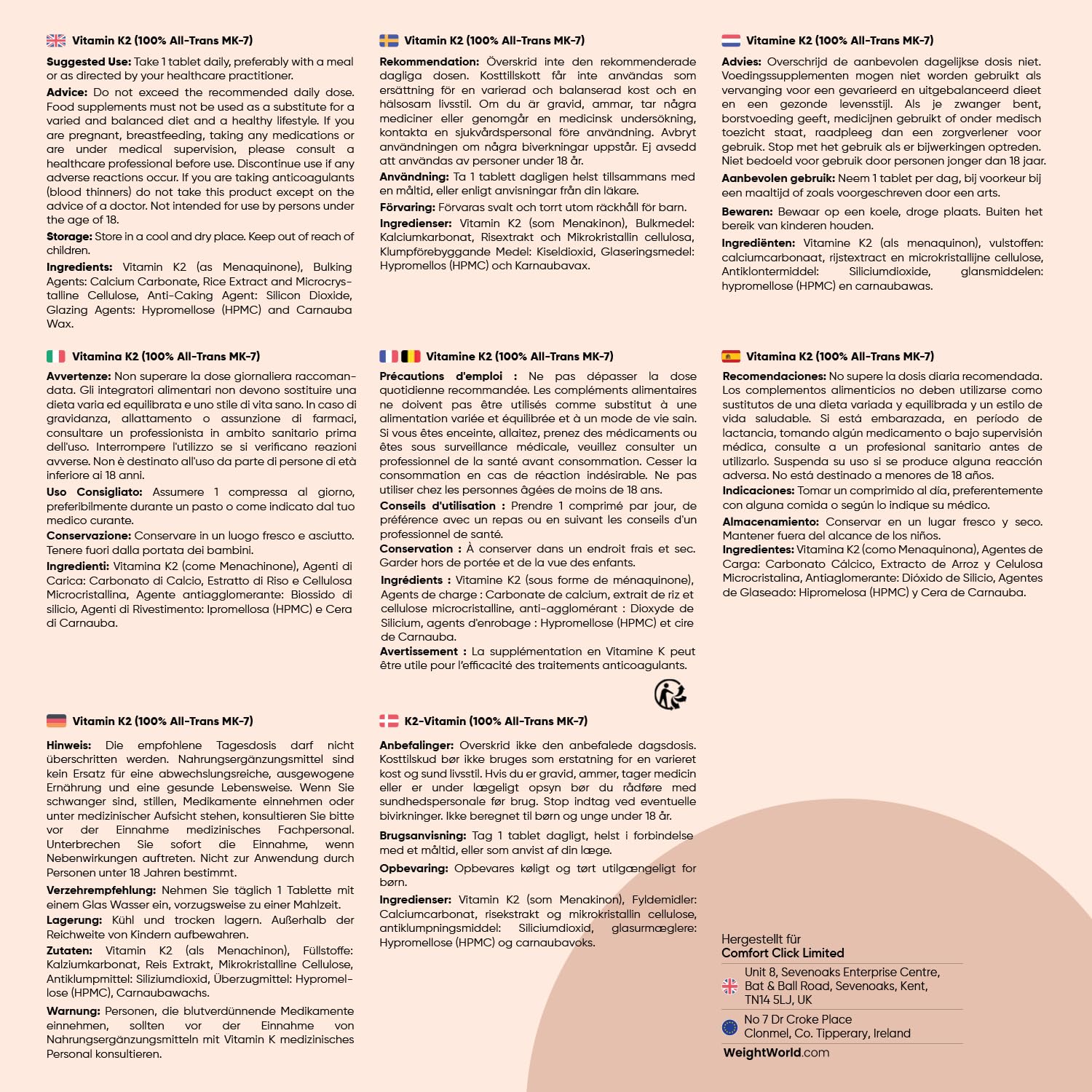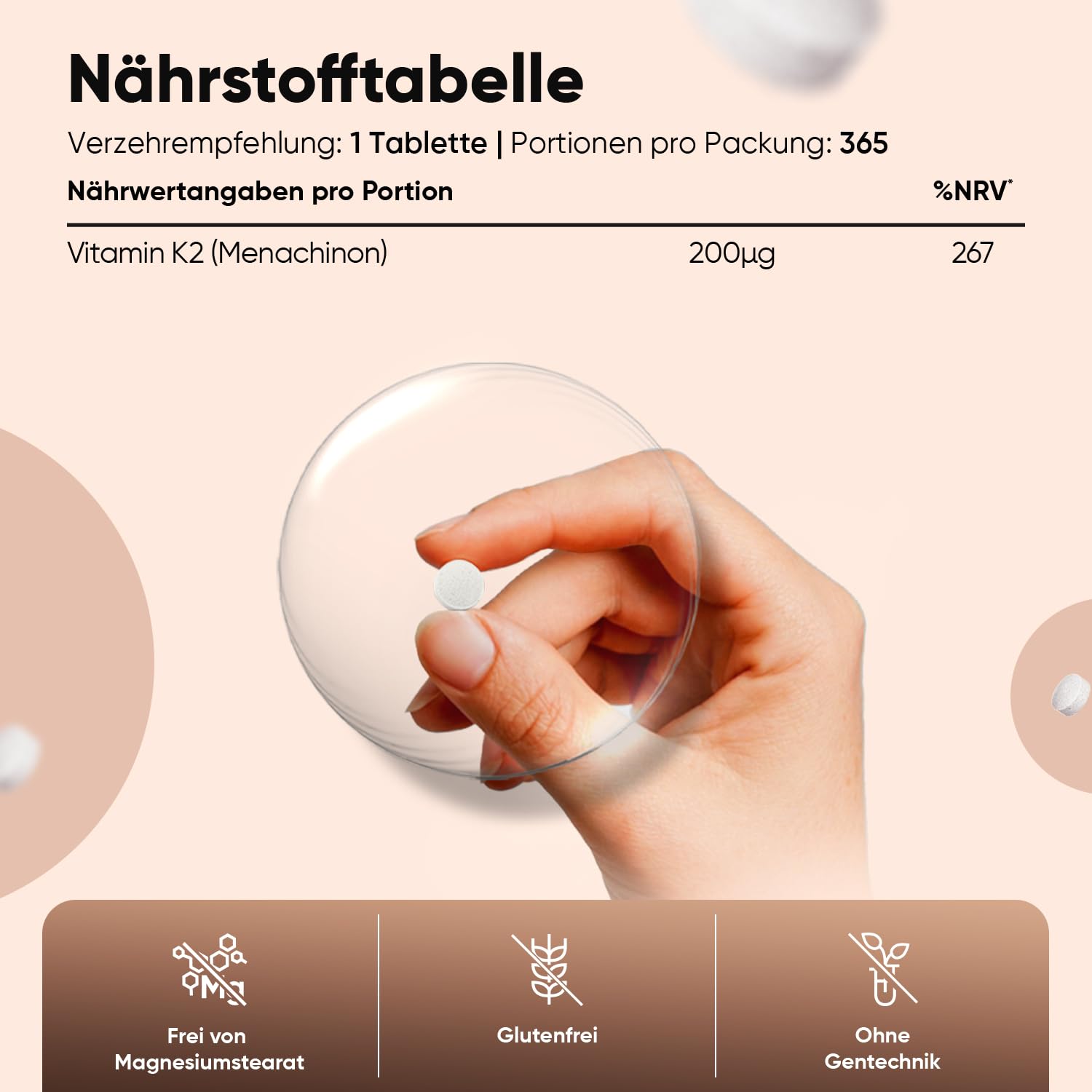 - K2 vitamīna tabletes — K2 vitamīns ir taukos šķīstošs vitamīns. Šīs tabletes satur 200 mcg K2 vitamīna all-transmenakinona MK-7. Produkts satur 365 tabletes ar piedevu 1 gadam.
