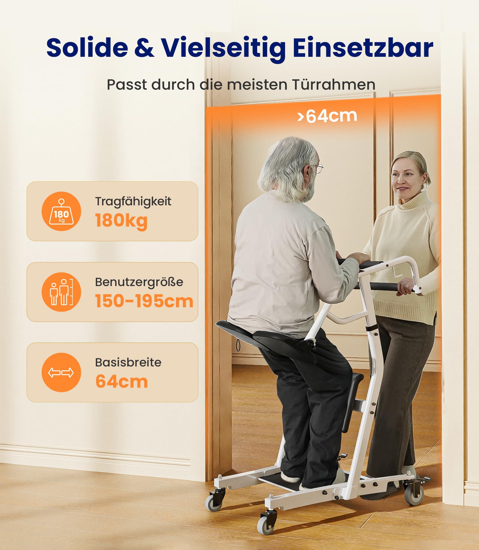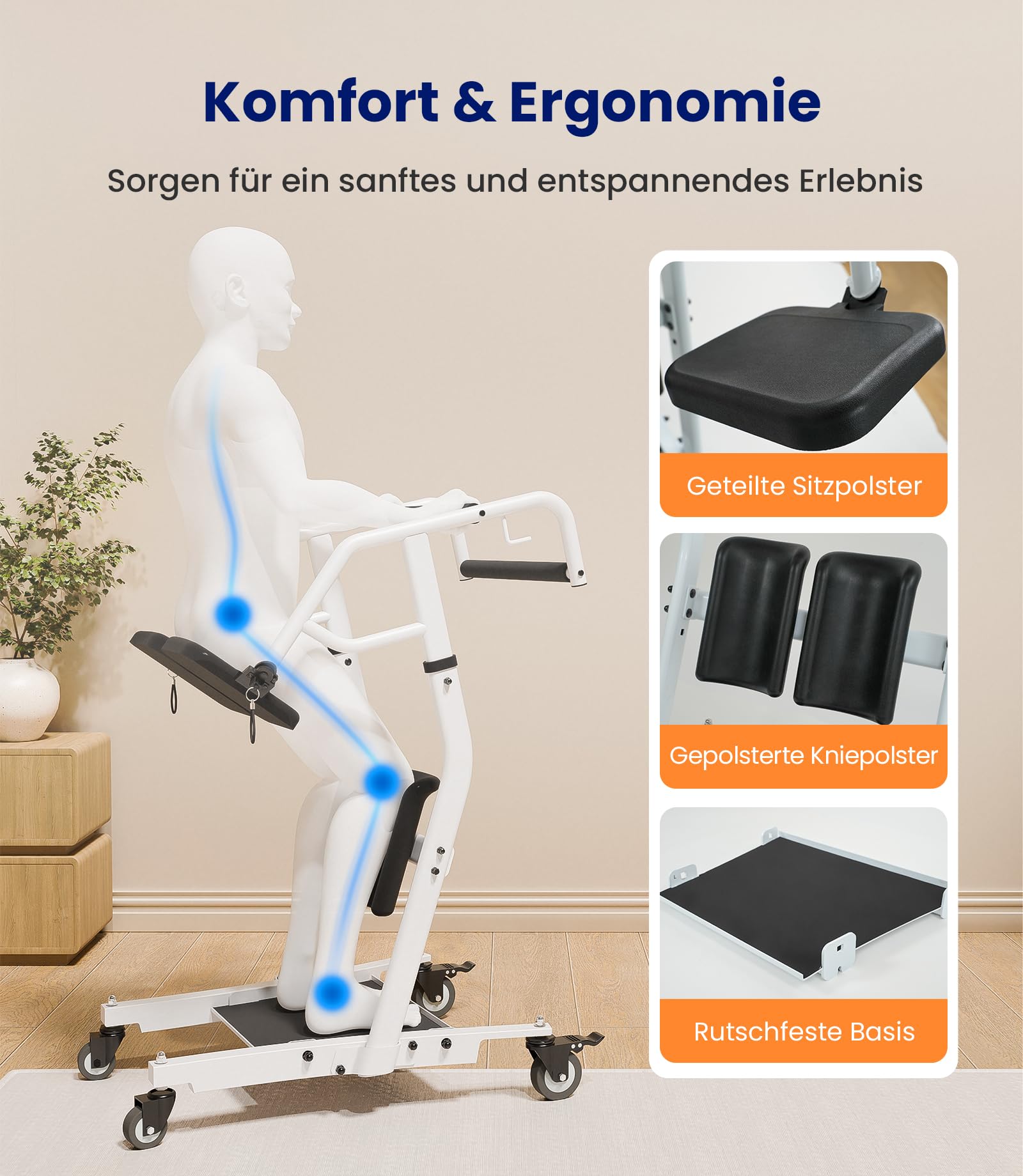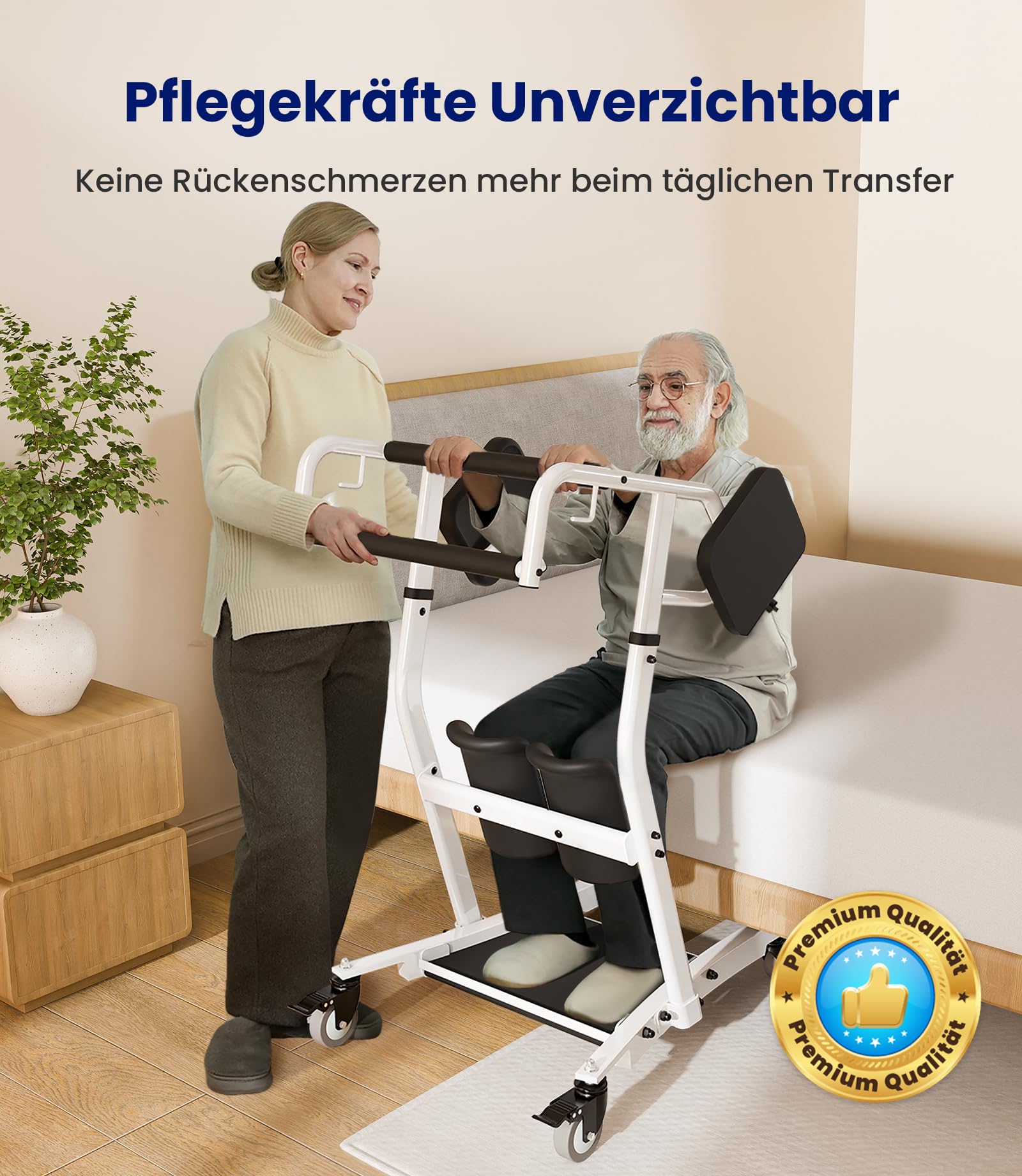 - 【Neaizstājams aprūpētājiem】 Šis sēdus-stāvus pacēlājs ir īpaši izstrādāts, lai atvieglotu aprūpētāju ikdienas dzīvi un padarītu pacientu piecelšanos un pārvietošanu pēc iespējas ērtāku un drošāku. Tas veicina mobilitāti un samazina piepūli, kas nepieciešama, pārvietojoties starp gultu, tualeti vai citām sēdvietām. Celtspēja līdz 180 kg. Ieteicams cilvēkiem, kuri spēj stāvēt patstāvīgi