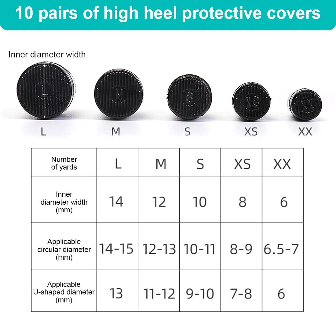- 🎋Dažādi izmēri: XX kods, piemērots apaļiem papēžiem 6,5–7 mm, U veida papēžiem 6 mm; XS kods piemērots apaļiem papēžiem 8-9 mm, U veida papēžiem 7-8 mm.