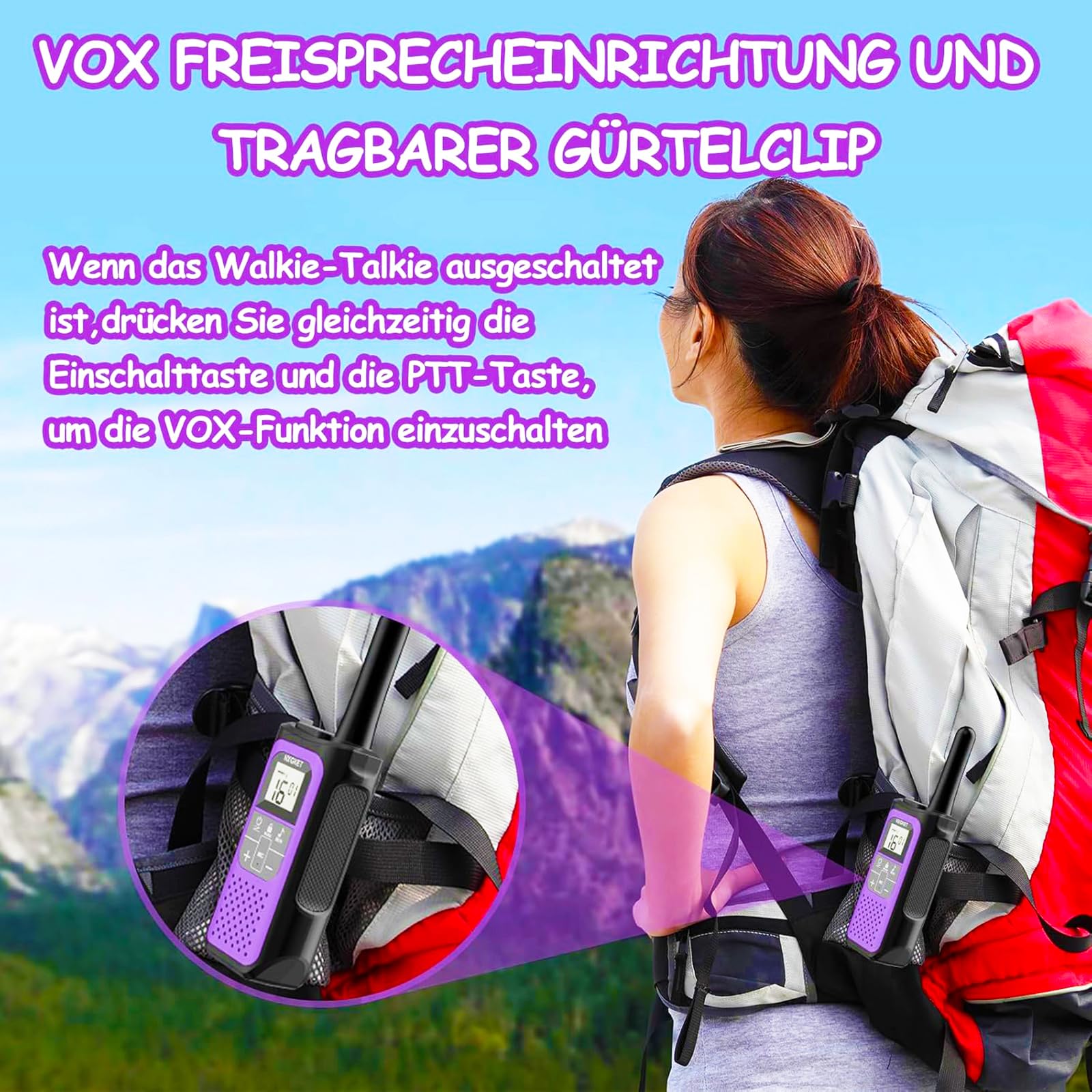 - ATBRĪVOJIET SAVAS ROKAS: Parastajā režīmā iestatiet to pašu kanālu un apakškodu un ilgi nospiediet PTT pogu, lai veiktu zvanu. Pēc VOX režīma izvēles (izslēdzot ierīci, vienlaikus nospiediet ieslēgšanas/izslēgšanas pogu un rācijsaziņas pogu), varat ērti sazināties, nespiežot rācijsaziņas pogu. VOX funkcija un jostas klipsis palīdz atbrīvot rokas, kad esat aizņemts, padarot to piemērotāku spēlēm un aktivitātēm brīvā dabā.