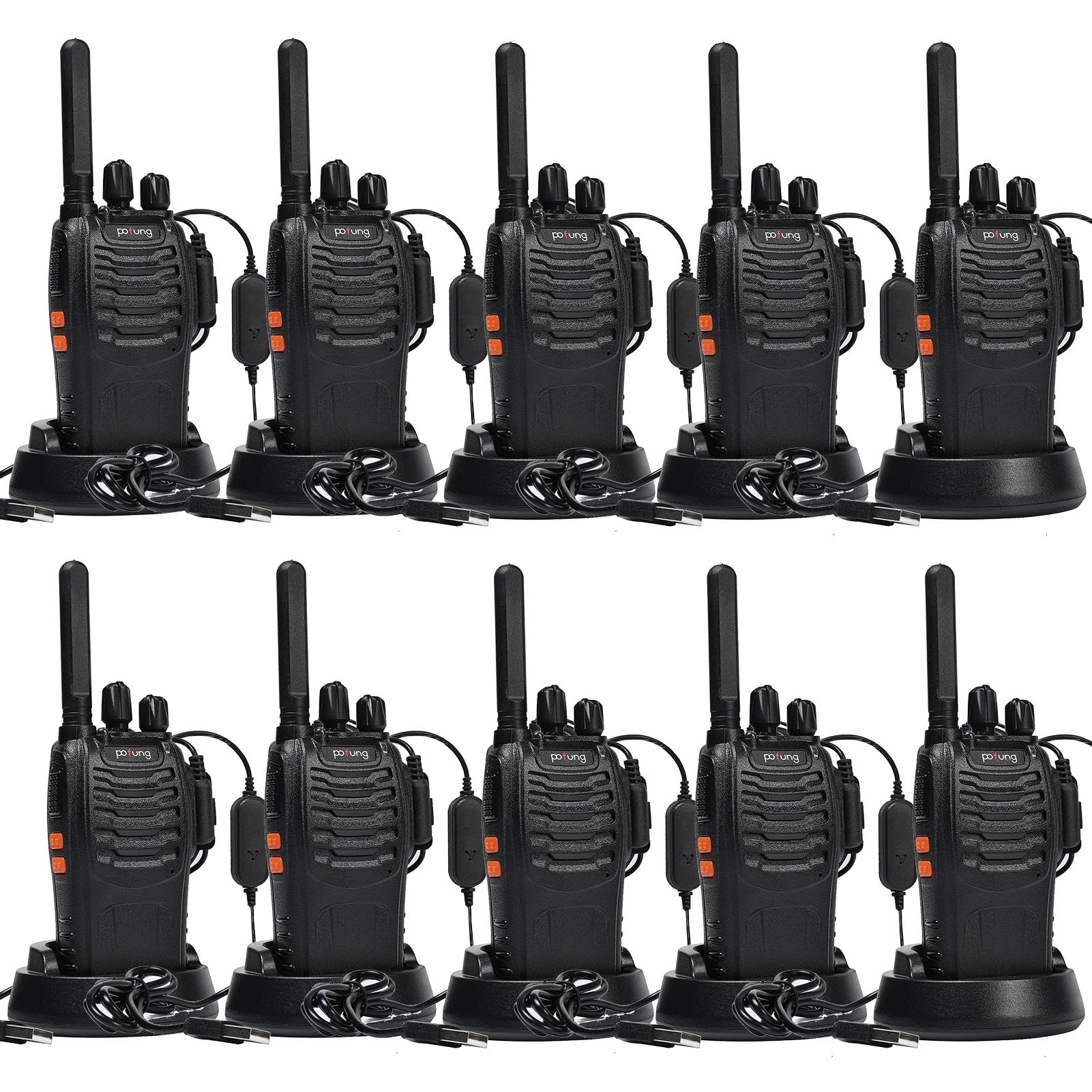 Rācija PMR446 bezlicencēts divvirzienu rācija, Pofung PT88E 16 kanāli Profesionāla uzlādējama liela darbības rādiusa rācija ar USB uzlādes staciju un austiņām, melna, 10 gab. iepakojumā