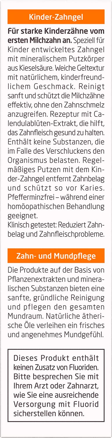 - IZSTRĀDĀTS PIENA ZOBIŅIEM: Speciāli izstrādāts piena zobu kopšanai un bērna mutes dobuma floras harmonizēšanai, bērnu zobu gels nesatur nekādas vielas, kas apgrūtina organismu. Minerālu tīrīšanas līdzekļi nodrošina maigu un rūpīgu zobu tīrīšanu