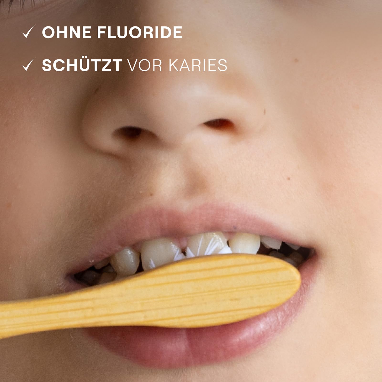Vegānā bērnu zobu pasta bez fluorīda ir īpaši izstrādāta piena zobu kopšanai un bērna mutes dobuma floras harmonizēšanai. Tas nesatur vielas, kas varētu kaitēt bērna organismam, ja želeja tiek norīta.