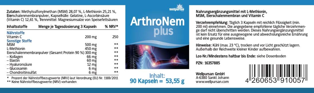Wellpursan ArthroNem Plus - 90 locītavu kapsulas osteoartrīta un locītavu sāpju atbalstam, locītavu komplekss ar MSM un C vitamīnu, uztura bagātinātājs locītavām un skrimšļiem