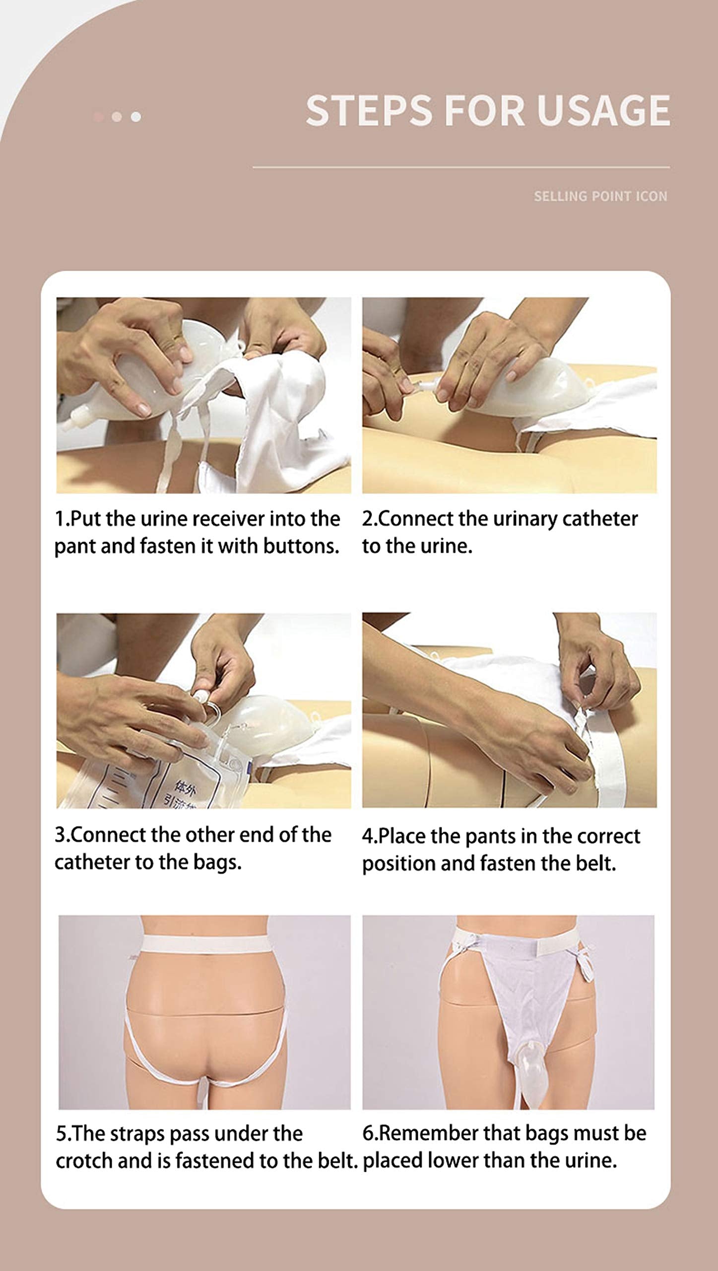 Komplektā ietilpst biksītes, pisuārs, urīna savācējs, 1000 ml maisiņš un 2000 ml maisiņš urīna savācējam. Ideāli piemērots gados vecākiem un slimiem pacientiem, lūzumu, paralīzes, biežas urinēšanas, urinēšanas steidzamības, urīna nesaturēšanas un pacientiem ar neskaidru teozofiju.