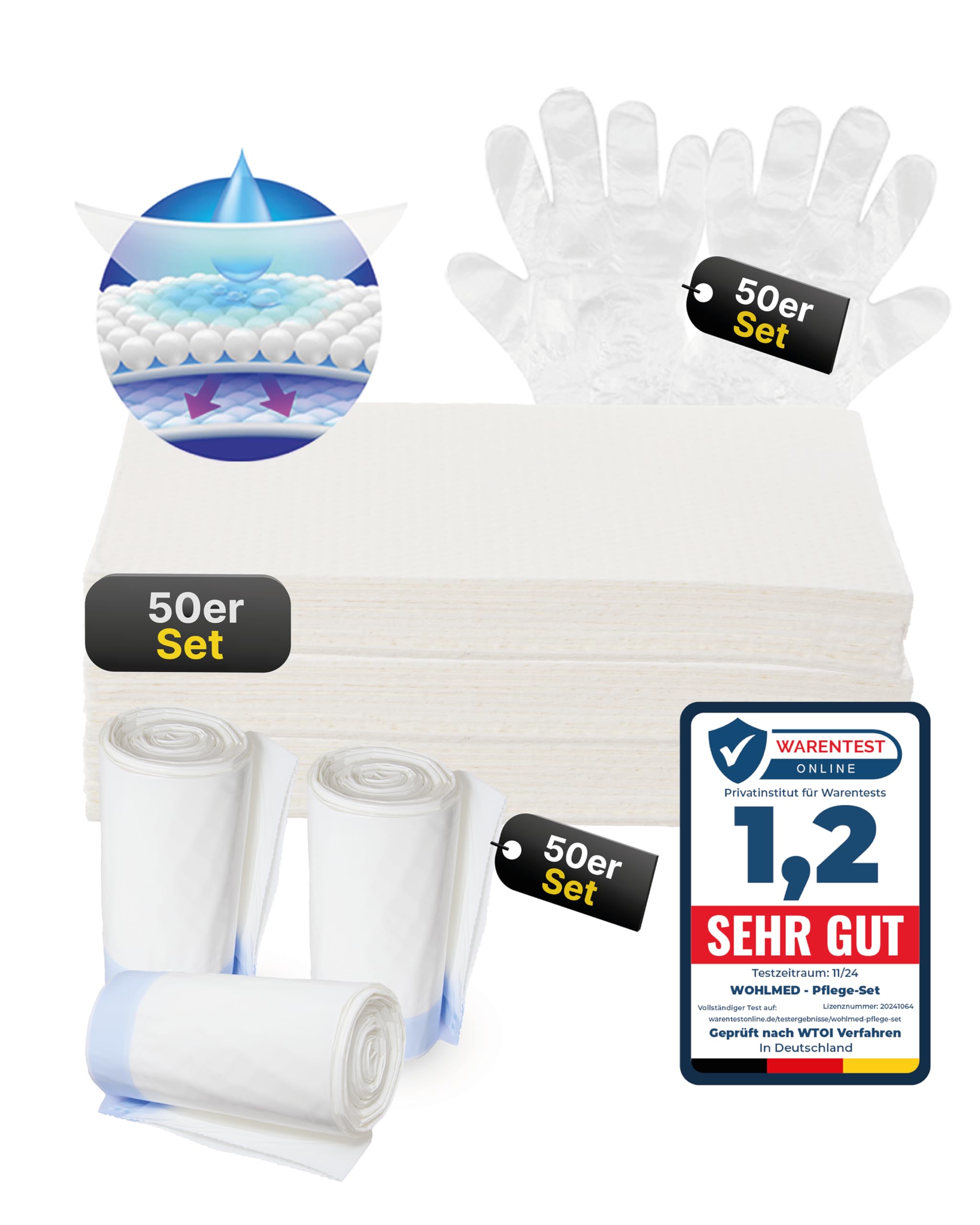 - ✅PIEMĒROTS GULTAS BIKSĒM: Neatkarīgi no tā, vai esat mājās, pēc operācijas, kempingā vai gultas biksīšu kopšanai — jūsu tualetes piederumu maisiņu, absorbējošu spilventiņu un 50 vienreizlietojamo cimdu pāru komplekts piedāvā ātrus un higiēniskus risinājumus. Tātad jūs esat labi sagatavojies neatkarīgi no tā, kas notiek