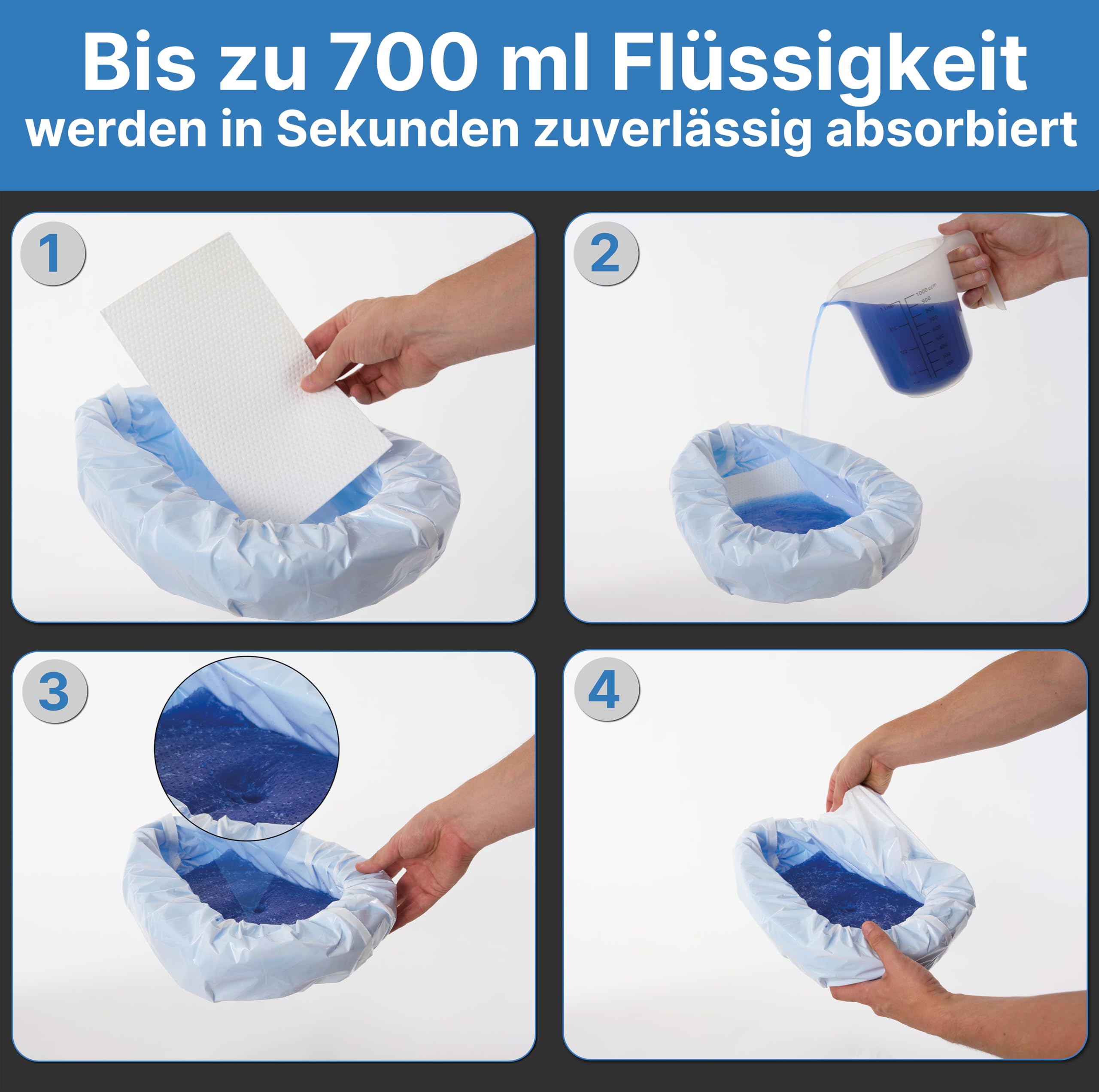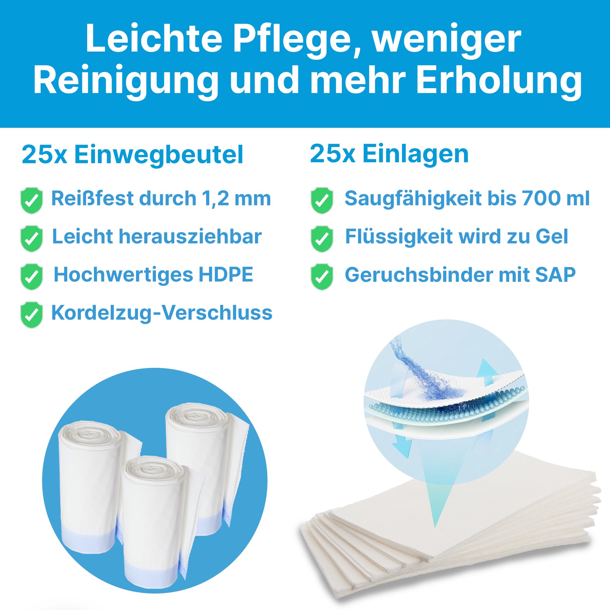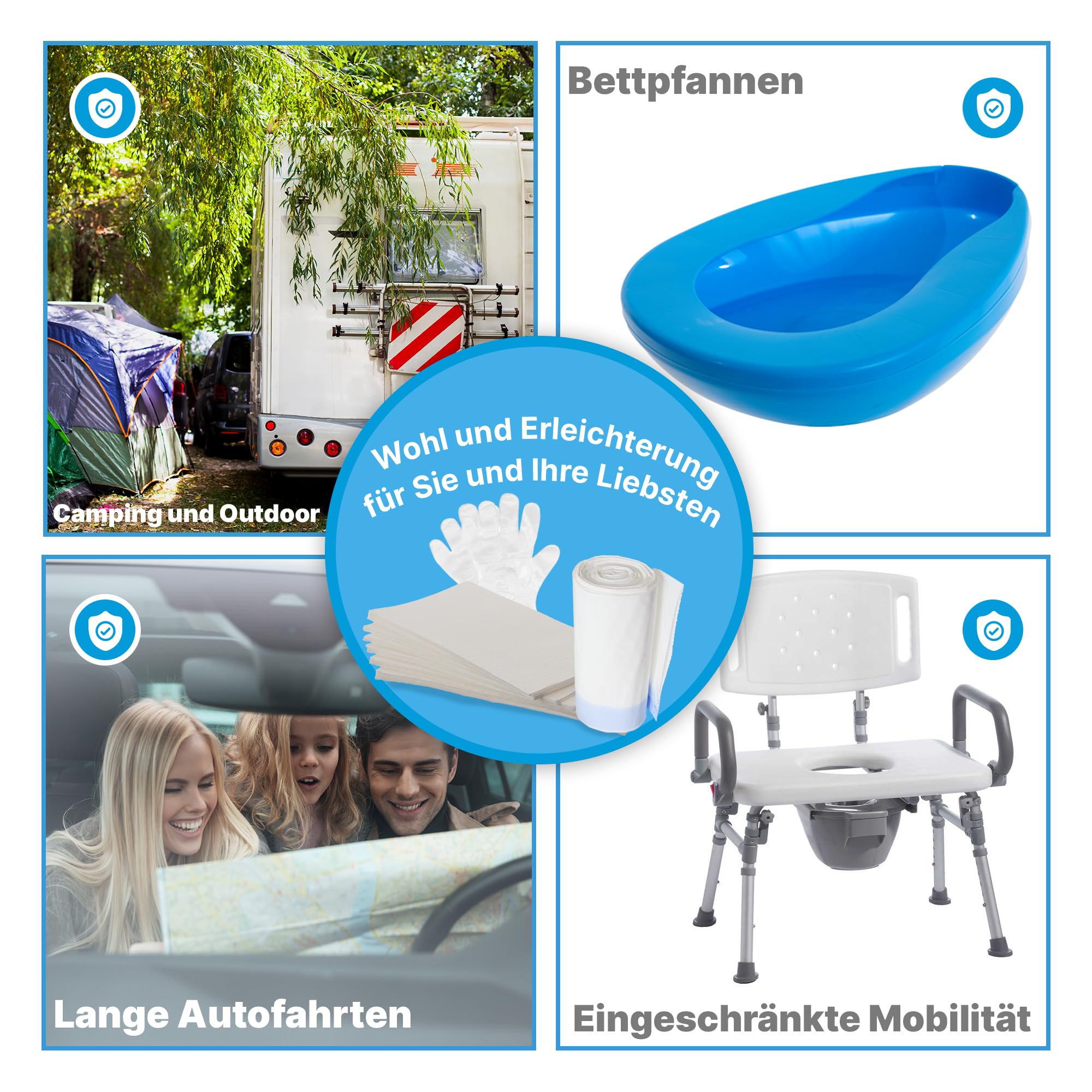 - ✅IDEĀLI PIEMĒROTS IKVIENAM: Ikdienā vai ceļojumā, tualetes krēslam, gultas podam vai kempinga tualetei — mūsu tualetes maisiņi un absorbējošie paliktņi pielāgojas ikvienai situācijai. Tie piedāvā jums un jūsu mīļajiem drošību un higiēnu, ko esat pelnījuši, un sniedz uzticamu atvieglojumu, kad vien tas visvairāk nepieciešams.