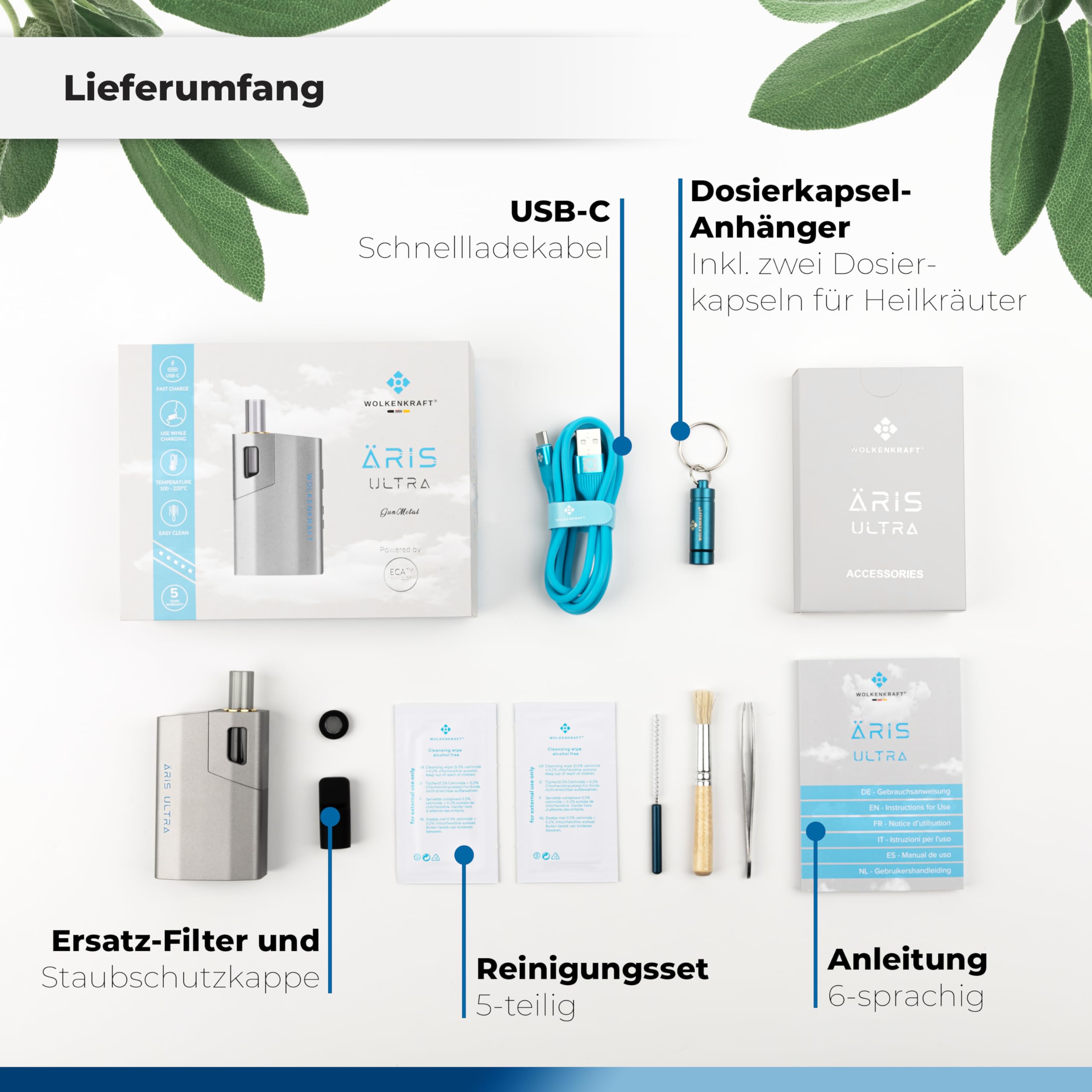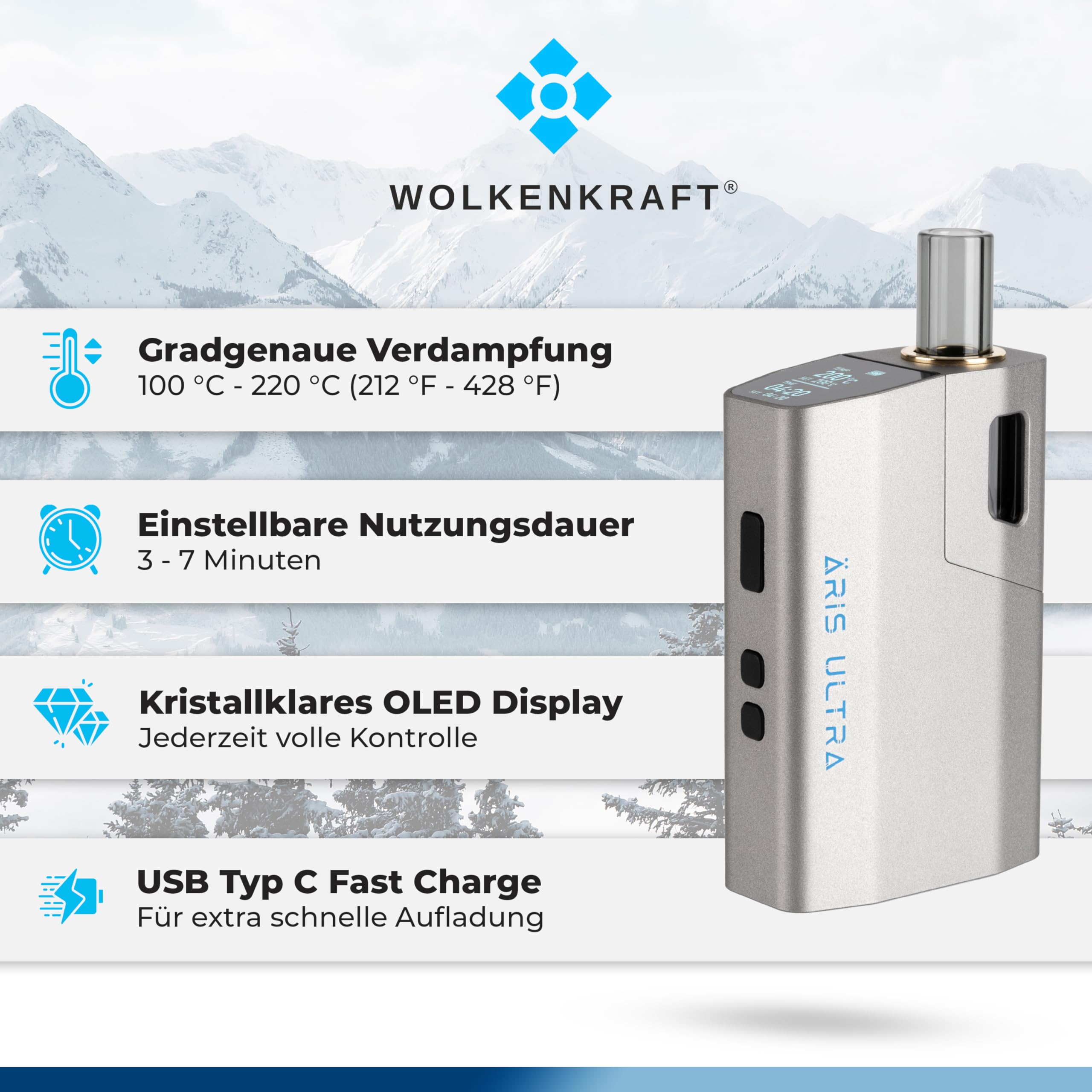 - [Precīza iztvaikošana no 100 °C līdz 220 °C] Temperatūras kontrole ir vēl vairāk optimizēta un temperatūras diapazons ir paplašināts. ÄRiS ULTRA tagad nodrošina temperatūru no 100 °C līdz 220 °C, piedāvājot plašāku un elastīgāku spektru gandrīz visu veidu ārstniecības augiem.