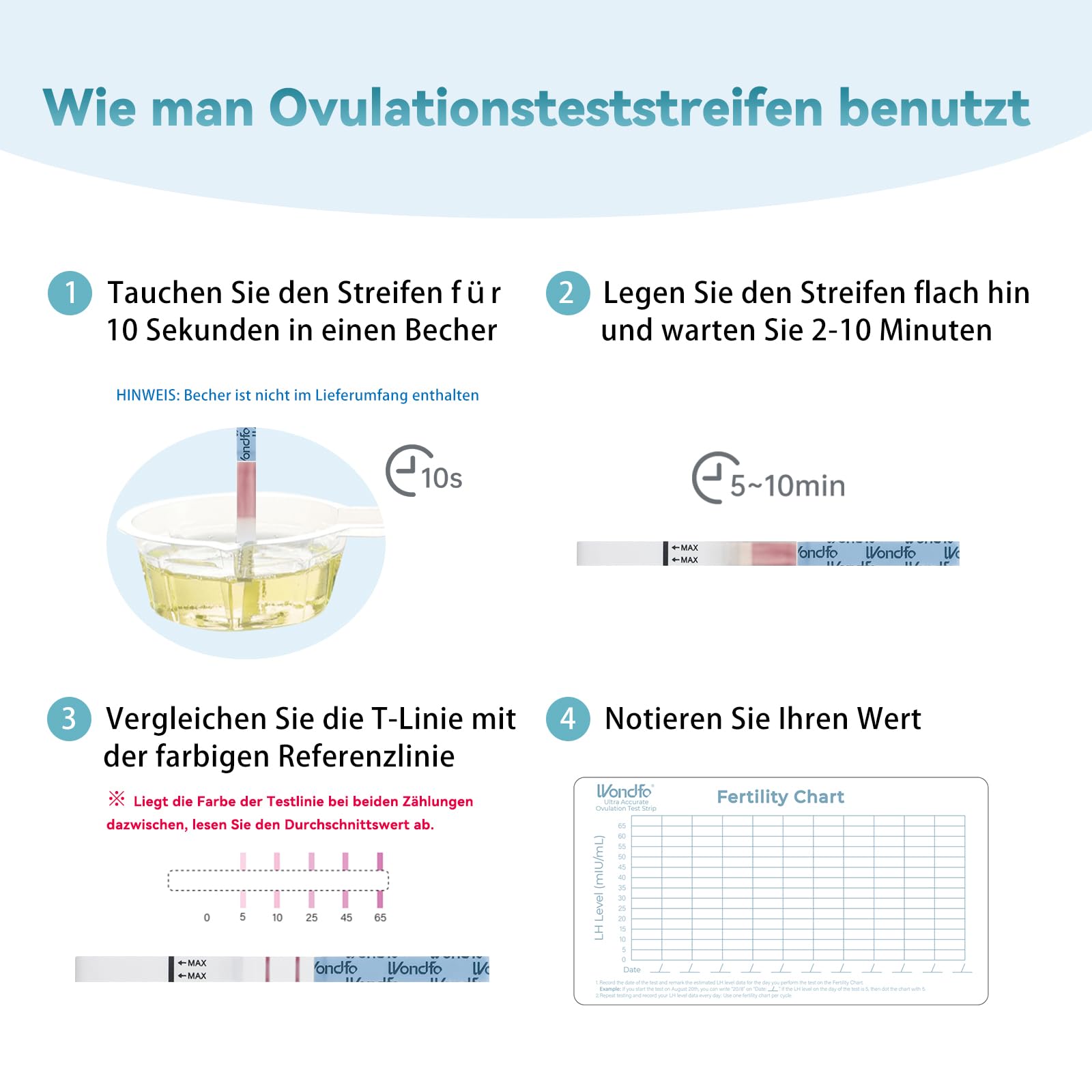- Vienkārša lietošana: iegremdējiet testa strēmeli urīnā uz 10 sekundēm un nolasiet rezultātu 5–10 minūšu laikā. Salīdziniet T-līniju ar iekļauto krāsu diagrammu. Lai prognozētu ovulāciju, katru dienu ievadiet savu LH līmeni auglības diagrammā.